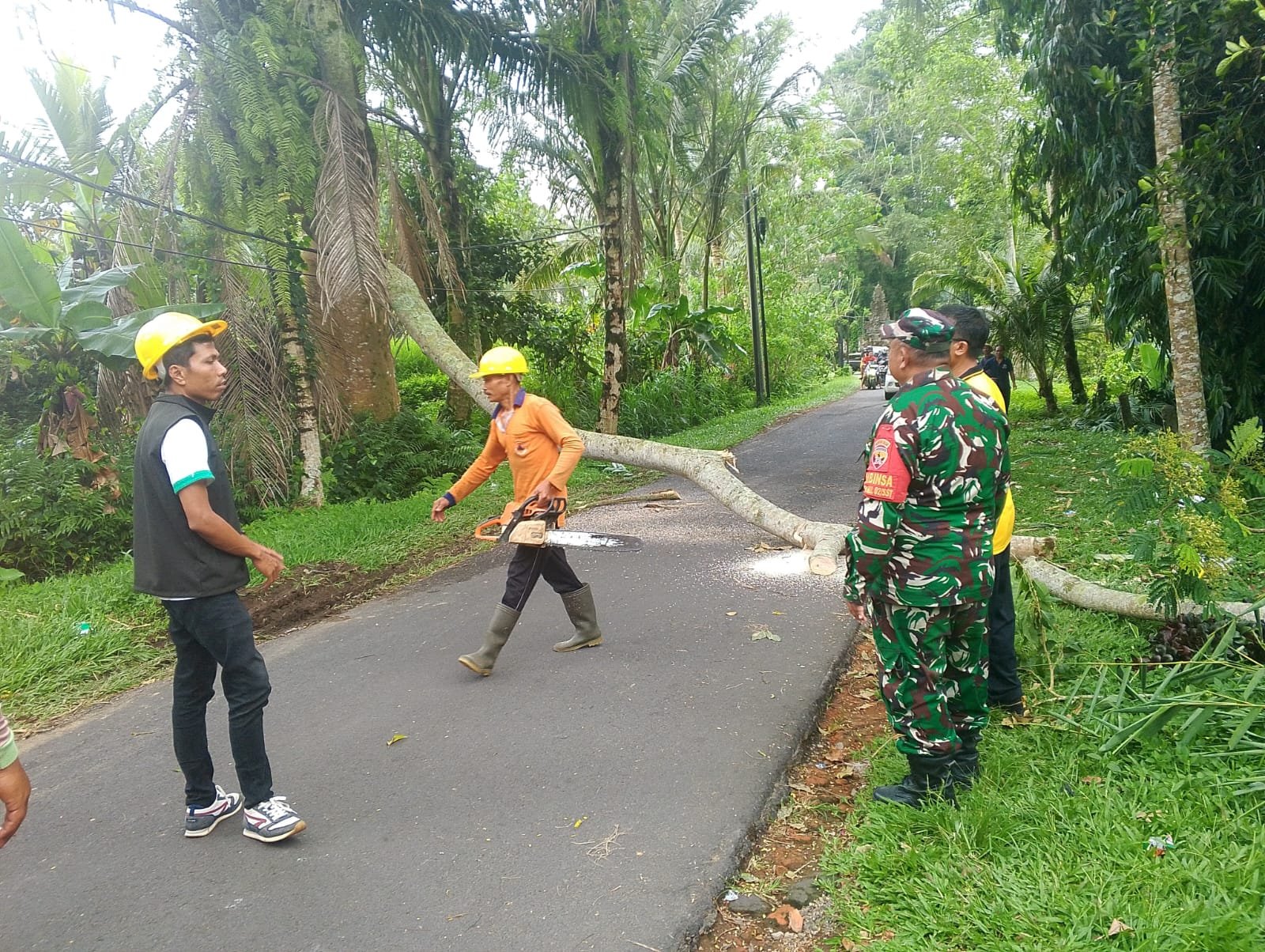 Kegiatan ini dilakukan secara sigap demi menjaga kelancaran arus lalu lintas dan keselamatan pengguna jalan. Berkat kerja sama antara Babinsa, Bhabinkamtibmas, serta masyarakat sekitar, pohon yang tumbang berhasil dipotong dan jalur dapat kembali dilalui kendaraan dengan aman.
