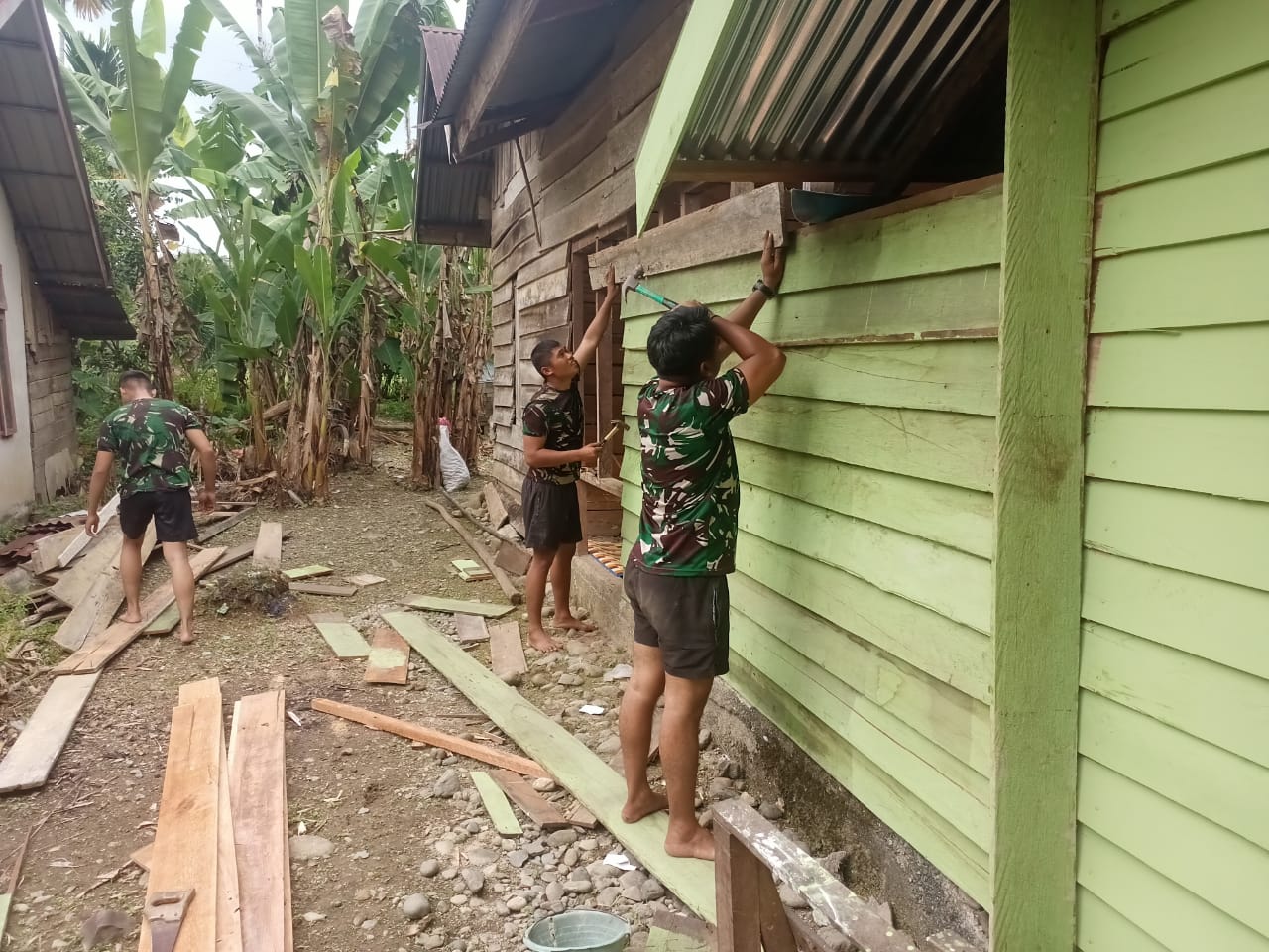Dengan kerja bergotong royong seperti ini, rumah yang sebelumnya terlihat rapuh perlahan berubah menjadi tempat tinggal yang lebih kokoh dan nyaman.