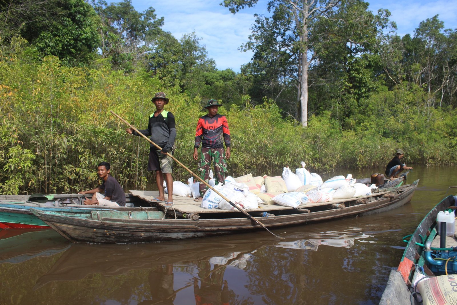 Material seperti semen, koral, dan pasir dikirim melalui sungai menggunakan klotok, perahu bermesin yang biasa digunakan masyarakat setempat untuk transportasi air. Setiap klotok membawa muatan secara bergiliran dari dermaga logistik ke titik-titik pembangunan jalan yang telah ditentukan.