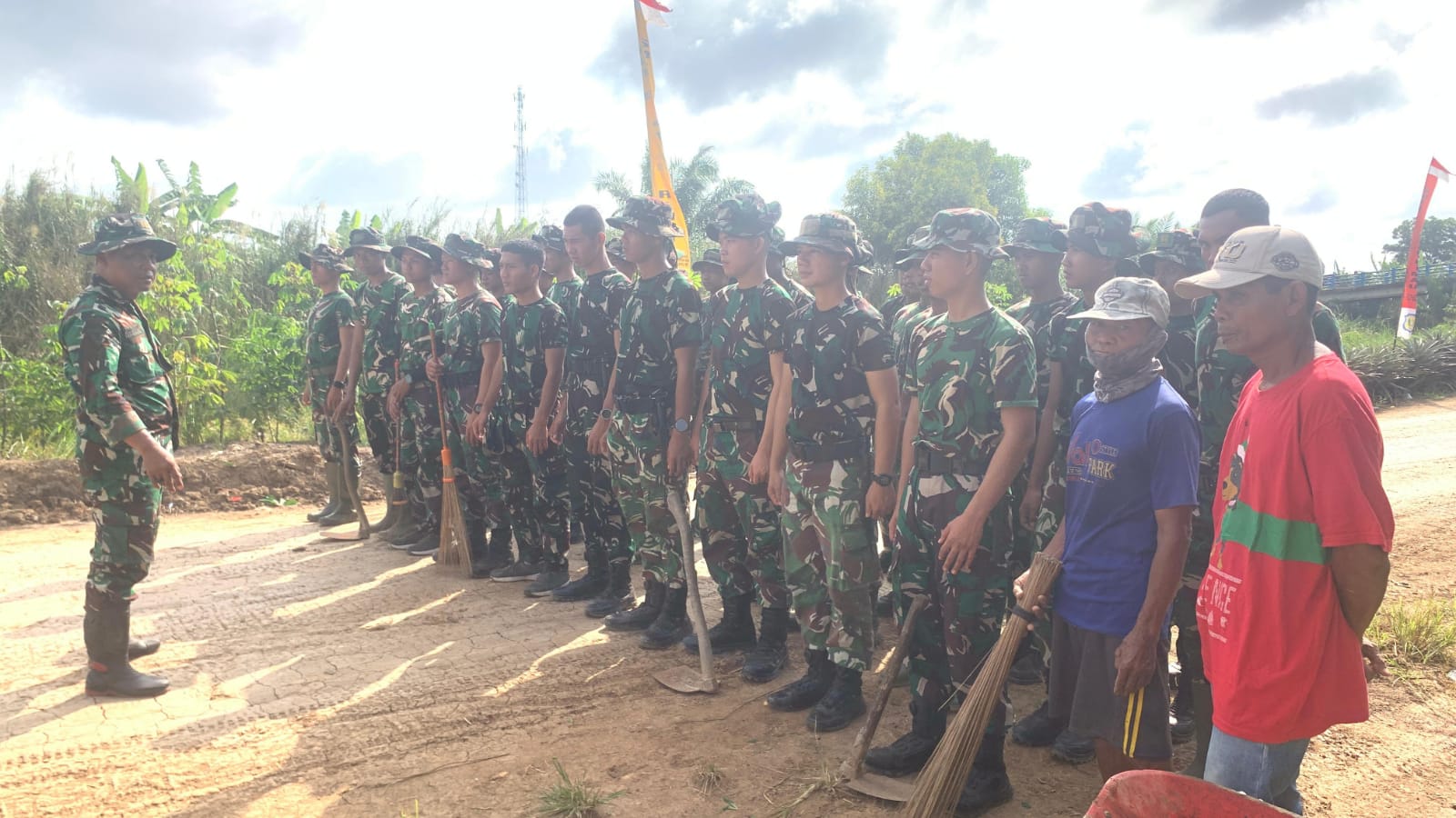 Setelah apel selesai, personel Satgas langsung bergerak untuk melaksanakan kegiatan pendukung di lapangan, termasuk membersihkan lokasi upacara pembukaan TMMD. Kegiatan pembersihan ini merupakan bagian dari persiapan sarana dan prasarana yang diperlukan.