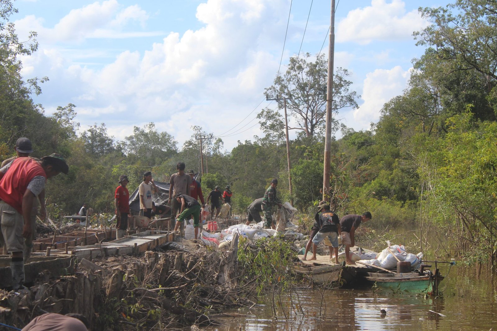 Selain kendaraan darat, pengangkutan juga memanfaatkan alat bantu seperti troli dan gerobak, terutama di lokasi yang tidak bisa diakses oleh kendaraan bermotor. Masyarakat ikut membantu dalam proses ini sebagai bentuk dukungan terhadap pembangunan yang mereka nantikan sejak lama.