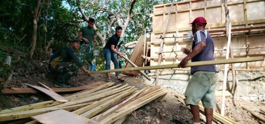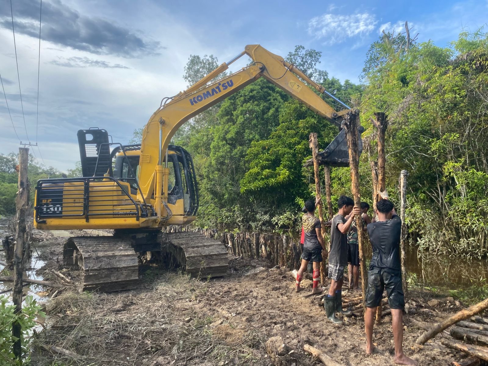 Proses ini menuntut ketelitian dan kerja keras karena setiap batang kayu harus tertancap dengan tepat dan kuat. Satgas dibantu oleh warga sekitar dalam melakukan pekerjaan ini secara estafet.