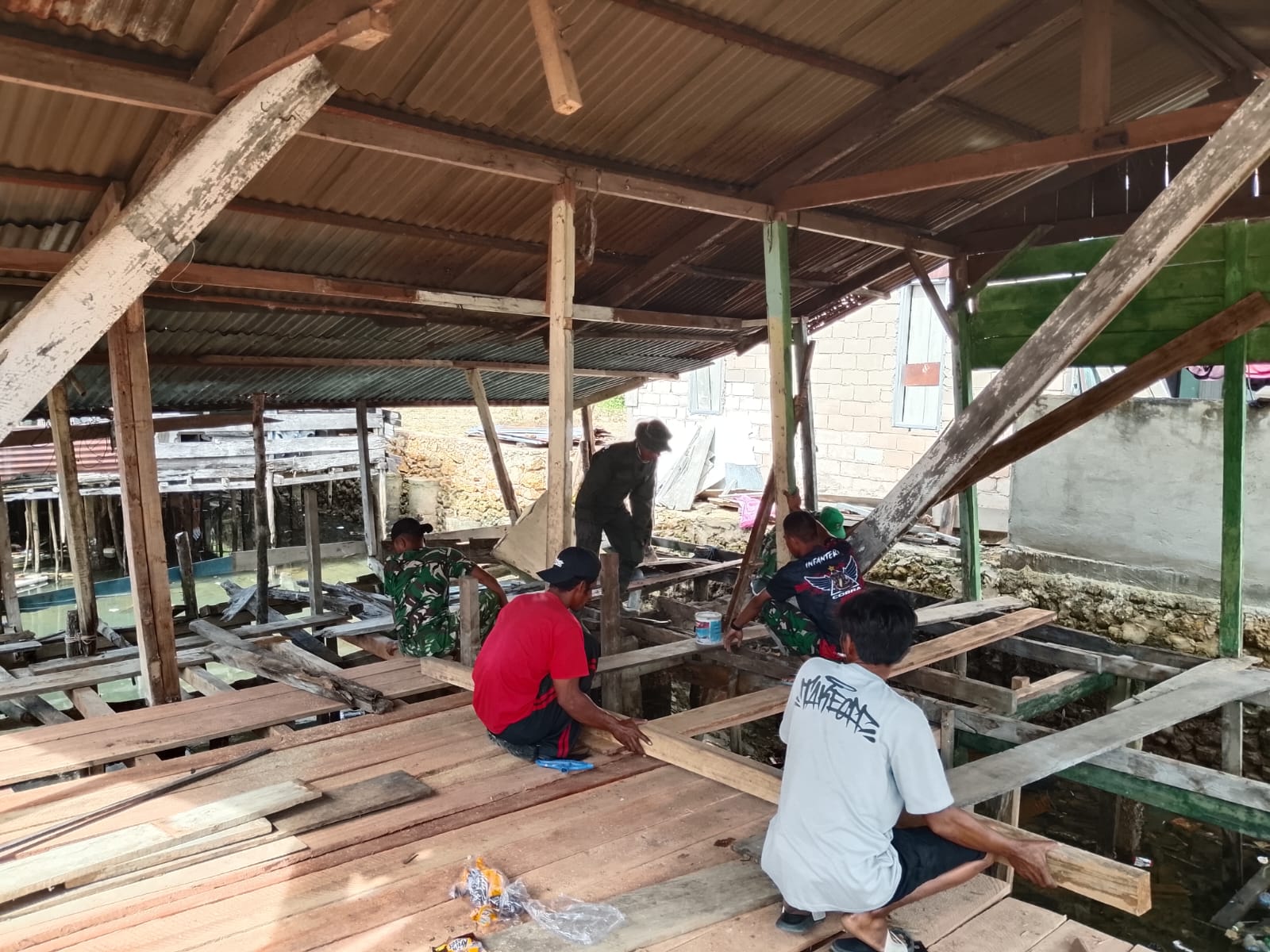 Anggota Satgas bekerja sama dengan masyarakat setempat dalam menyelesaikan berbagai tahapan dari renovasi, mulai dari perbaikan struktur bangunan hingga tahap finishing. Kerja sama ini mencerminkan semangat gotong royong yang kuat dalam komunitas.