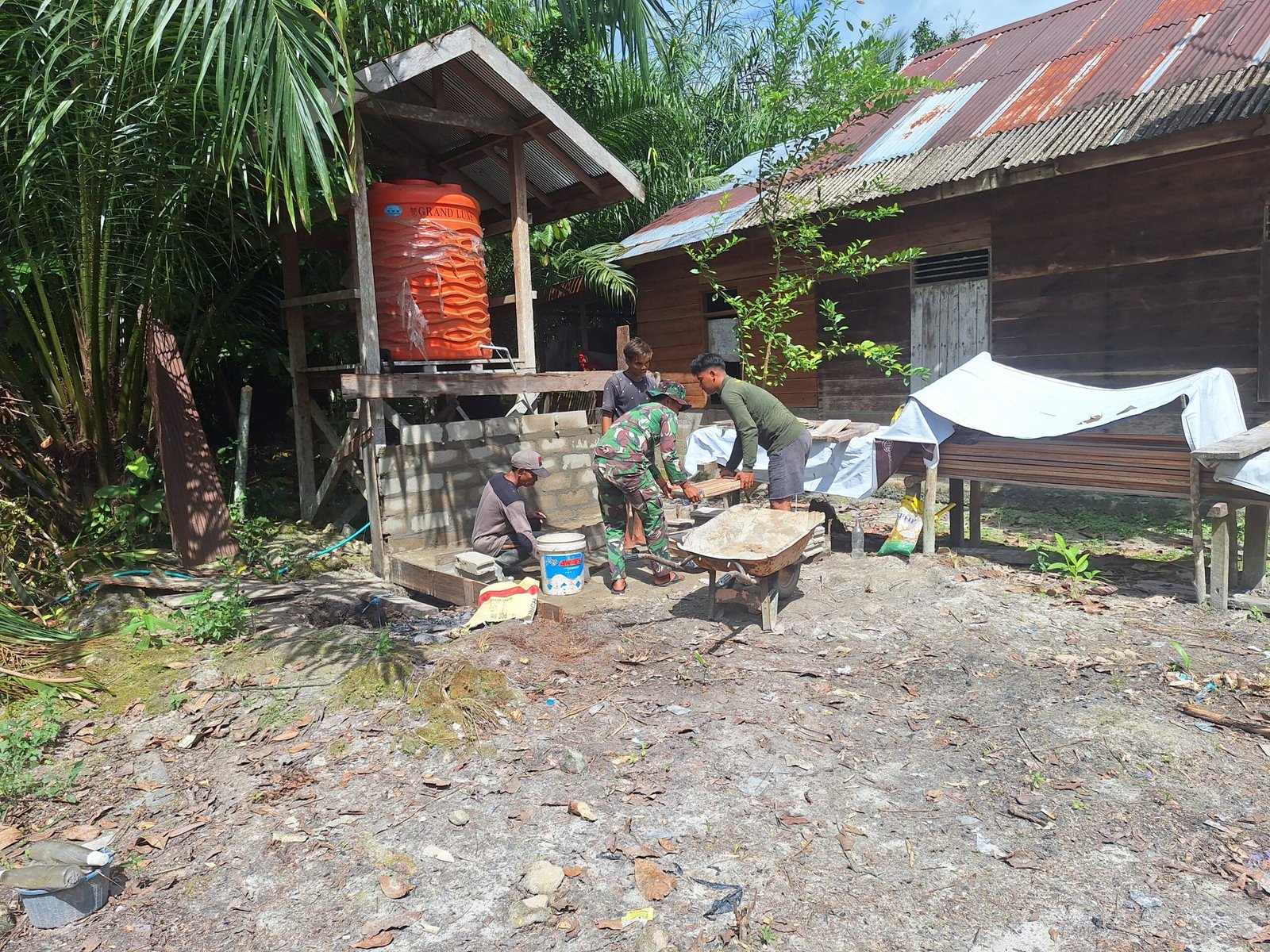 Karau Kuala, Barsel – Satgas TMMD Reguler Ke-124 Kodim 1012/Buntok terus menunjukkan semangat tinggi dalam pembangunan infrastruktur desa. Jumat (23/05/2025), sejumlah prajurit bersama warga mengambil cerucuk langsung dari aliran sungai di Desa Talio, Kecamatan Karau Kuala, untuk keperluan pembangunan jembatan penghubung.