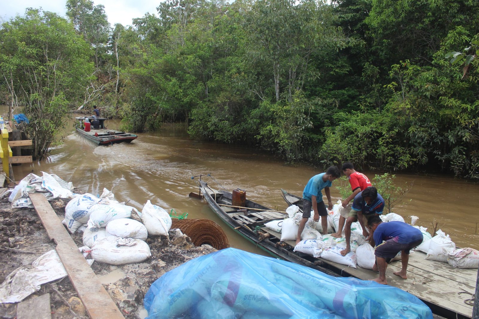 Karena medan yang sulit dan akses kendaraan terbatas, proses pengangkutan material dilakukan secara manual. Satgas dan warga saling bergantian membawa pasir, semen, dan batu kerikil dari titik bongkar menuju lokasi pengecoran dengan penuh semangat.