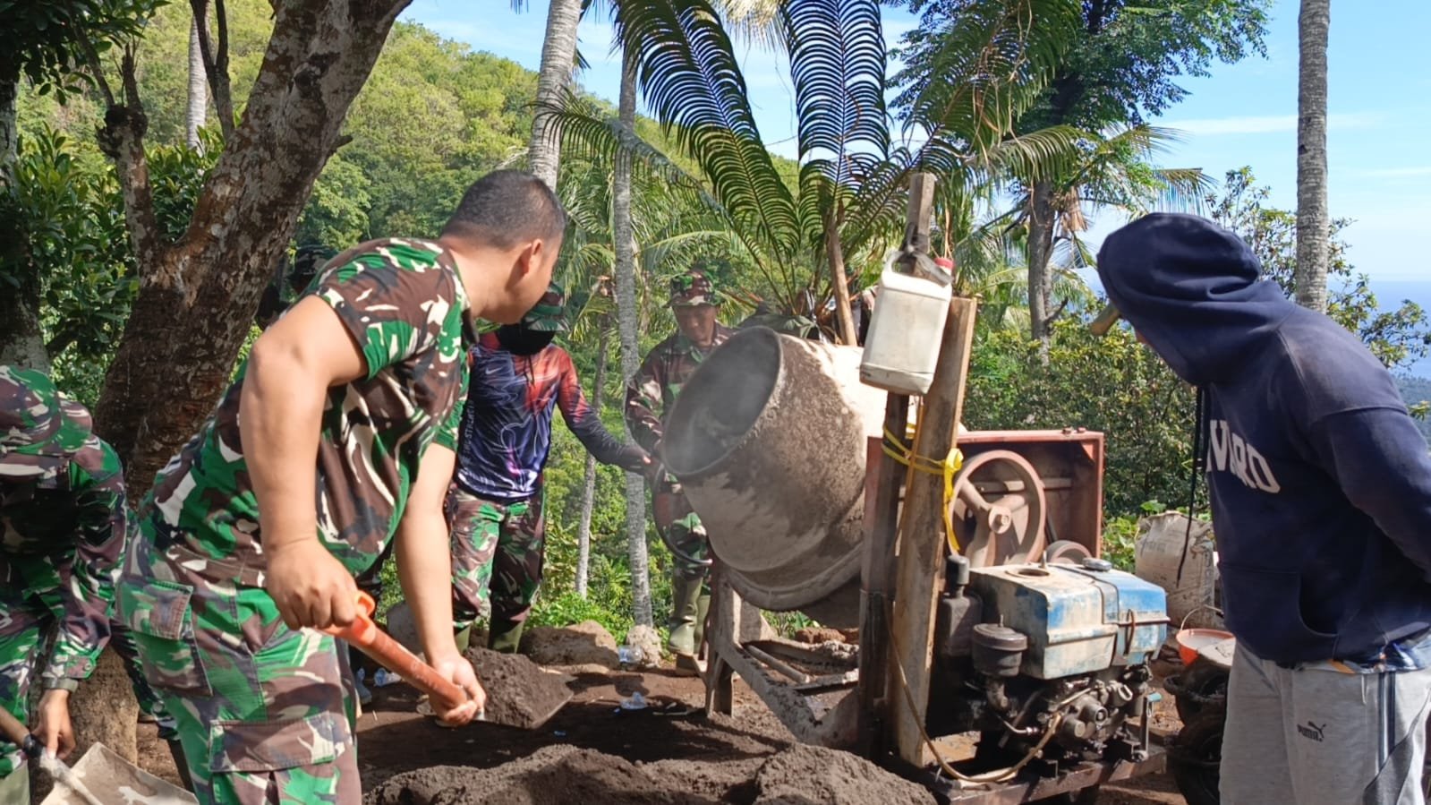 Prajurit TNI bersama masyarakat setempat tampak tak kenal lelah bekerja sama di lapangan. Setiap hari, mereka bahu-membahu mengaduk adonan semen menggunakan mesin molen, menambahkan material seperti pasir dan kerikil, hingga memastikan kualitas campuran untuk pengecoran tetap optimal.