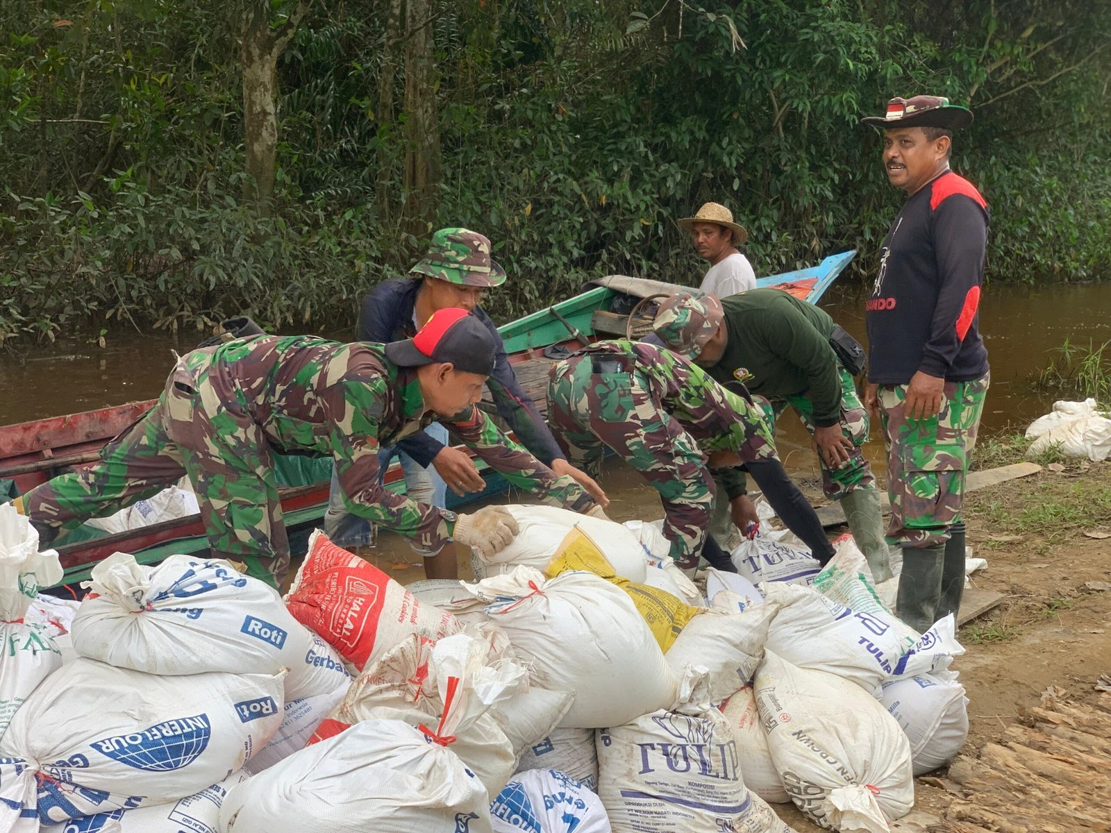 Material seperti pasir, kerikil, dan semen didistribusikan secara bergotong royong oleh Satgas dan warga untuk memastikan proses pembangunan berjalan lancar tanpa hambatan.