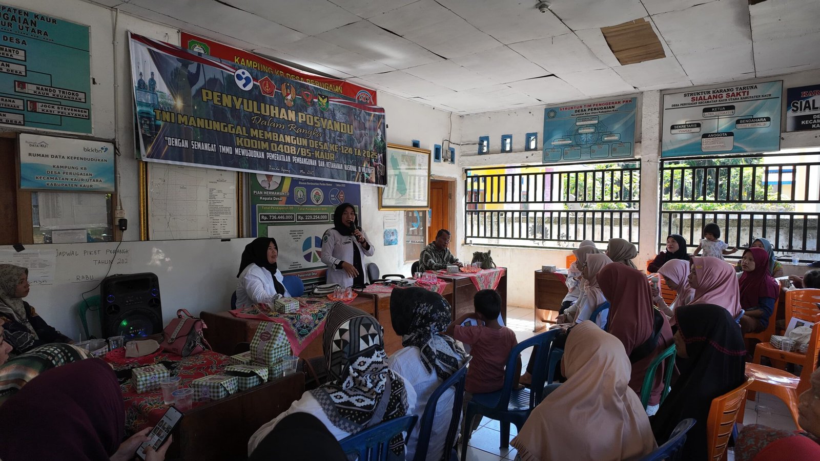 Kaur- Penyuluhan Posyandu dan sosialisasi Posbindu terus dilaksanakan dalam kegiatan TNI Manunggal Membangun Desa (TMMD) ke-124 Kodim 0408/BS yang dipusatkan di Balai Desa Bandu Agung Kecamatan Kaur Utara Kabupaten Kaur,Jumat (23/5/25).