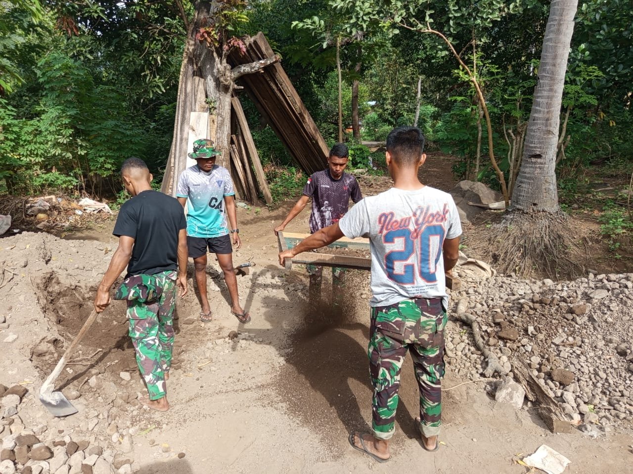 Personel Satgas TMMD bersama warga sekitar tampak bahu-membahu mengerjakan pembangunan RTLH dengan antusias. Kekompakan dan gotong royong yang terbangun menjadi cerminan nyata kemanunggalan TNI dan rakyat—nilai utama yang terus dijunjung dalam pelaksanaan TMMD.