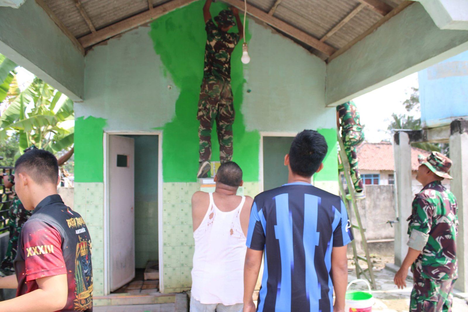Moris Jaya, Banjar Agung — Dalam rangka melanjutkan progres pembangunan sarana sanitasi, Satuan Tugas (Satgas) TMMD ke-125 Kodim 0426/Tulang Bawang bersama warga Kampung Moris Jaya, Kecamatan Banjar Agung, Kabupaten Tulang Bawang, melaksanakan pengecatan dinding kamar mandi pada Sabtu, 26 Juli 2025.