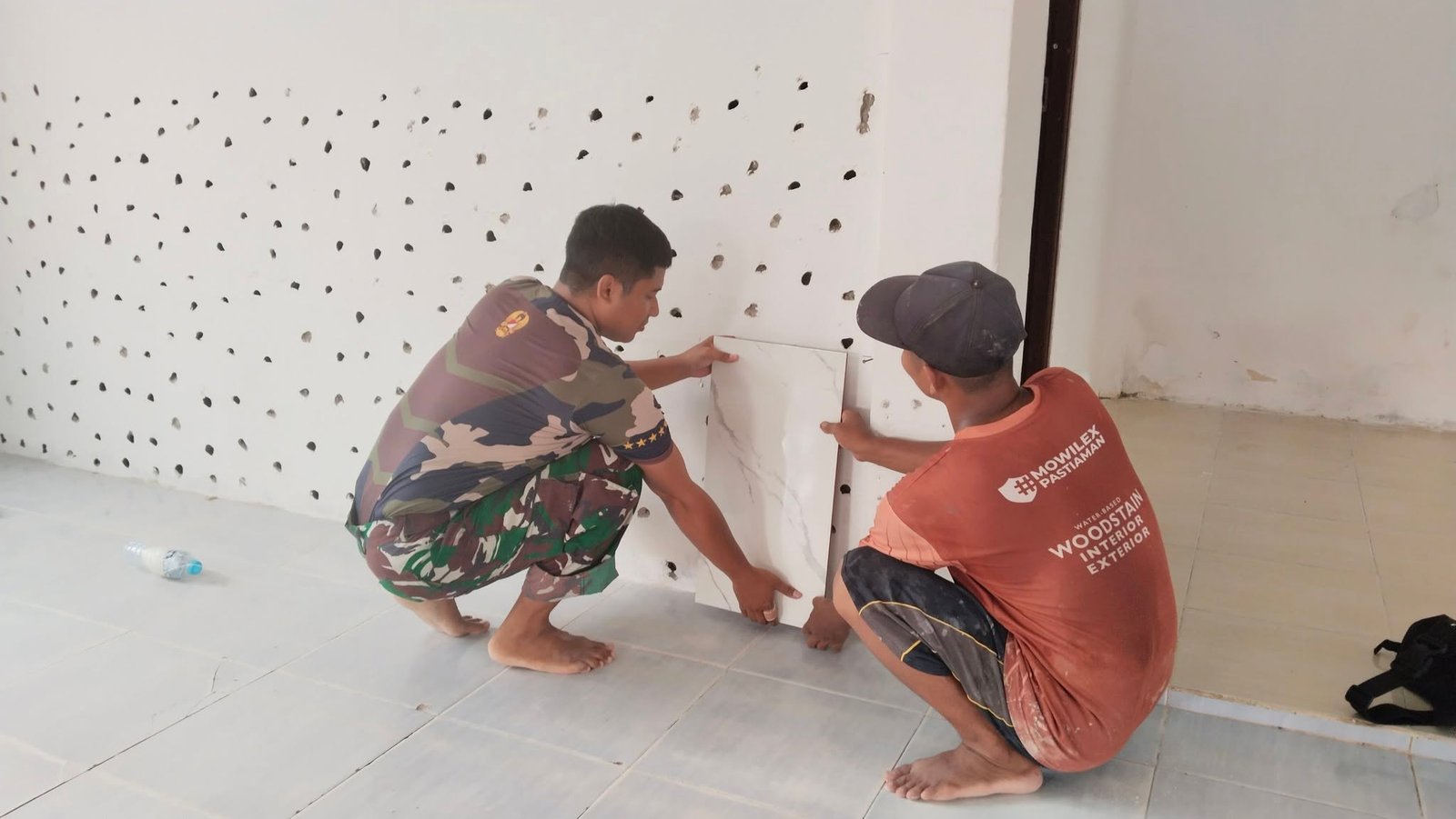 Kegiatan ini merupakan bagian dari sasaran fisik TMMD yang bertujuan memperbaiki sarana ibadah agar lebih layak, bersih, dan nyaman digunakan oleh masyarakat setempat. Proses pemasangan keramik dilakukan secara gotong royong antara prajurit TNI dan warga desa dengan semangat kebersamaan yang tinggi.