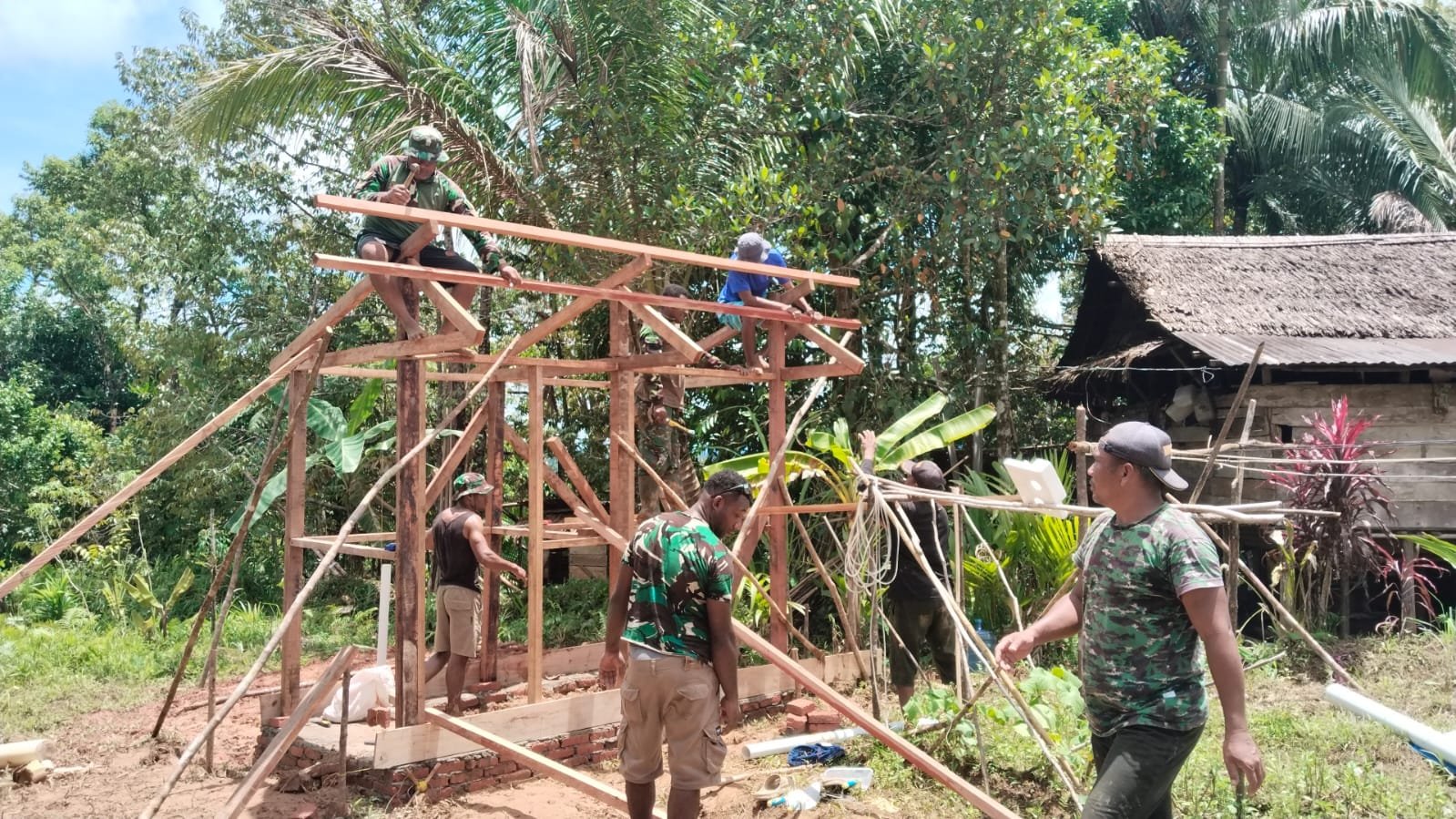 Proses pembangunan dimulai dengan pemasangan tiang penopang bangunan MCK yang dilakukan secara gotong royong antara anggota Satgas dan warga.