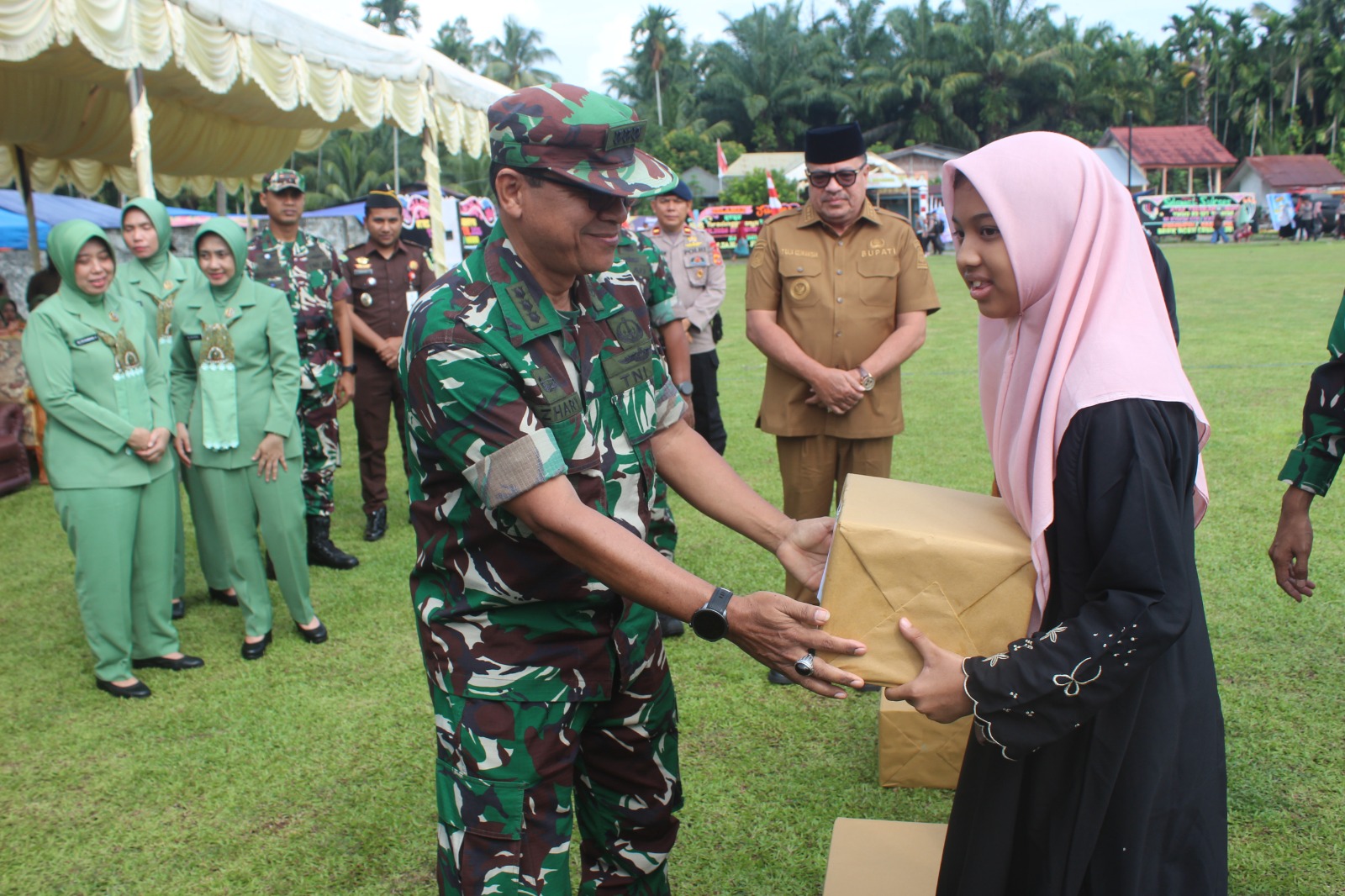 Kegiatan tersebut berlangsung dengan penuh kehangatan dan menjadi salah satu momen penting dalam penutupan program TMMD yang telah dilaksanakan selama satu bulan di wilayah Kabupaten Nagan Raya. Bantuan sembako diserahkan secara simbolis kepada masyarakat yang membutuhkan sebagai bentuk kepedulian sosial sekaligus wujud nyata kemanunggalan TNI dengan rakyat.