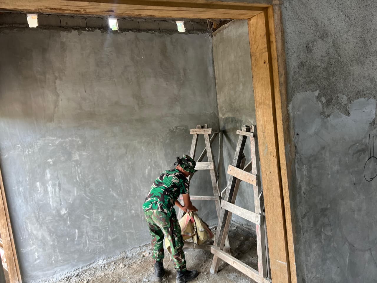 Personel Tentara Nasional Indonesia (TNI) yang tergabung dalam Satgas TMMD bekerja sama dengan masyarakat setempat dalam proses pembangunan rumah. Kegiatan ini mencakup penyelesaian pondasi, pemasangan dinding, dan pengerjaan struktur rangka bangunan agar hunian dapat segera dihuni.