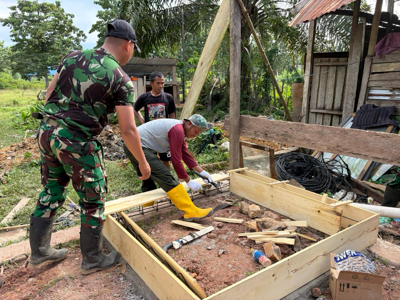 Terlihat di lapangan, seorang anggota TNI bersama warga setempat tengah menyusun rangka besi dan papan cetakan untuk pondasi MCK. Dengan peralatan sederhana dan penuh ketelitian, proses pembangunan dilakukan secara gotong royong, mencerminkan sinergi kuat antara TNI dan rakyat.