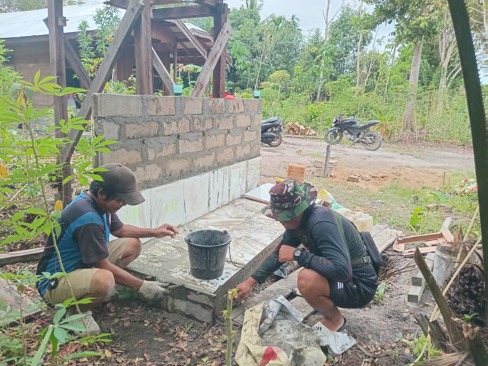 Pekerjaan dilakukan secara bertahap dimulai dari pengecoran pondasi kecil, pemasangan batako, hingga tahap akhir pelapisan semen. Satgas TMMD melibatkan warga setempat dalam proses pembuatannya, sehingga semangat gotong royong sangat terasa di lokasi pengerjaan.