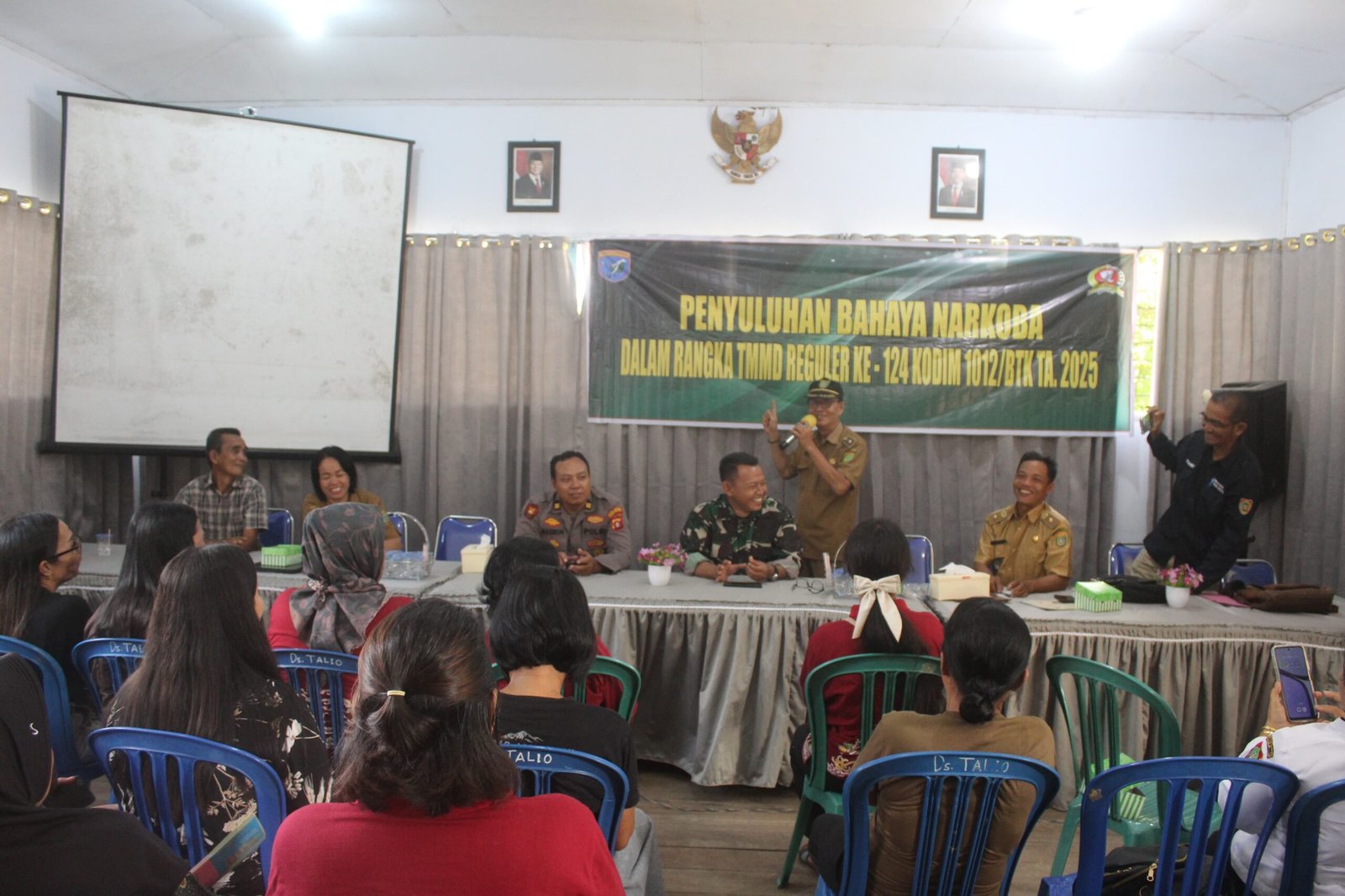 Talio, 27 Mei 2025 – Dalam rangka mendukung program pembangunan non-fisik, Satgas TNI Manunggal Membangun Desa (TMMD) Ke-120 Kodim 1012/Buntok menggelar penyuluhan hukum tentang bahaya narkoba di Balai Desa Talio, Kecamatan Karau Kuala, Kabupaten Barito Selatan, Senin (26/5).