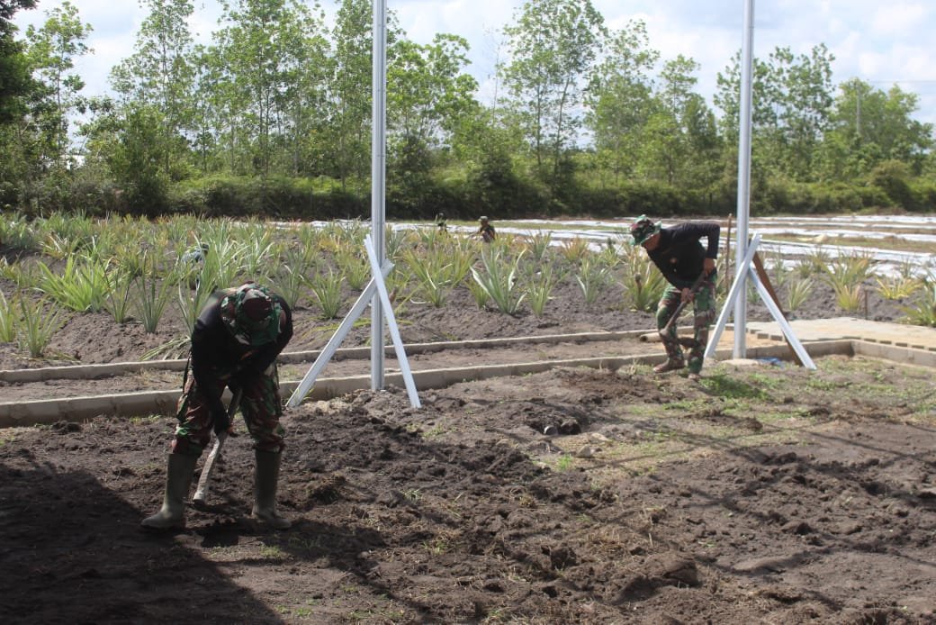 Satgas TMMD Kodim 1012/Buntok Gunakan Gerobak Dorong untuk Buang Rumput di Lahan Ketahanan Pangan