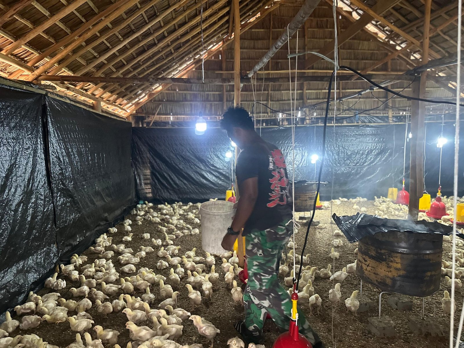 Satgas TMMD Kodim 1012/Buntok Rawat Ayam Potong di Lokasi Ketahanan Pangan Sababillah