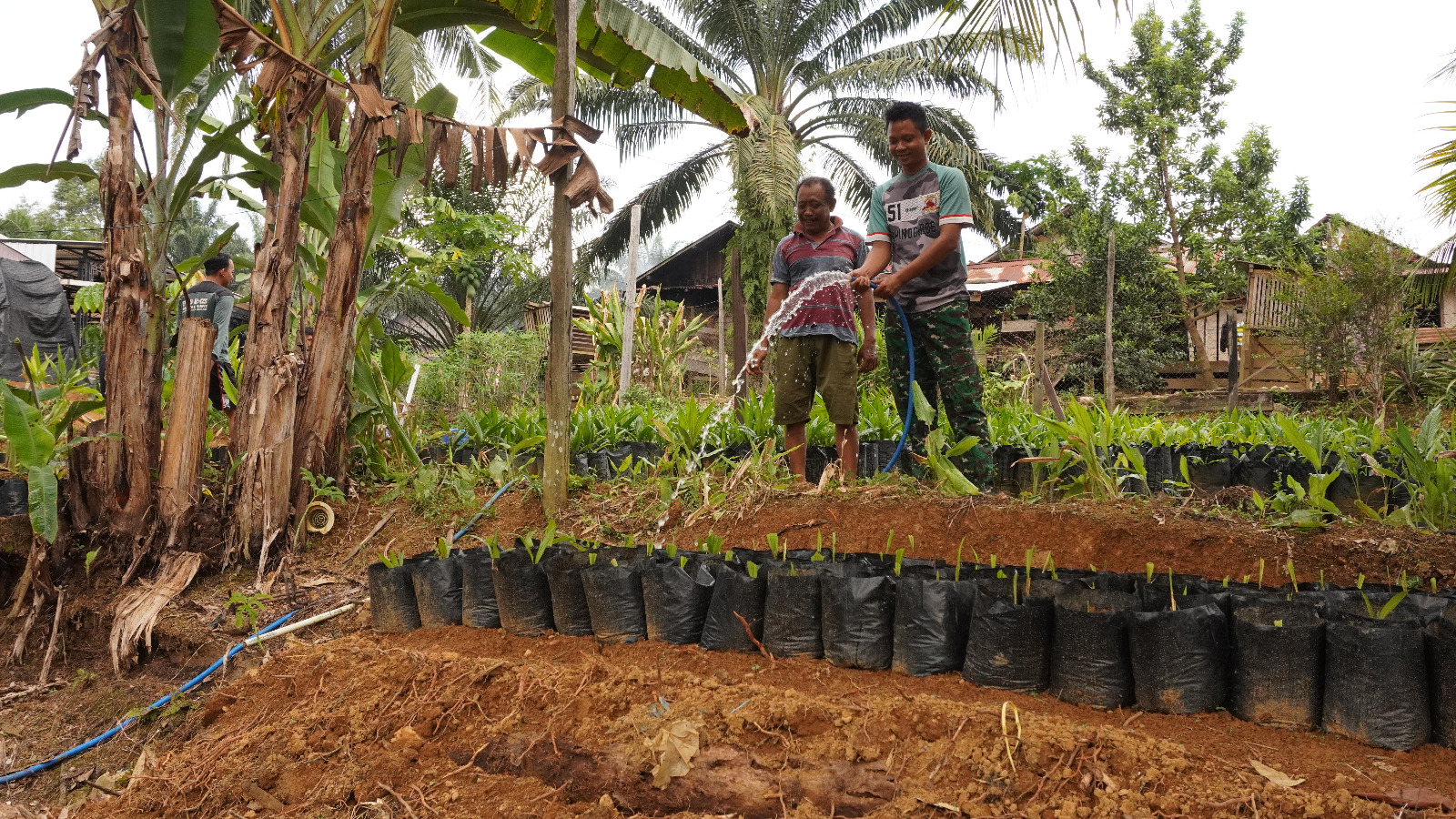 Dalam kegiatan ini, anggota Satgas TMMD, Praka Erwanto, memanfaatkan waktu istirahatnya untuk membantu menyiram bibit sawit milik Suparman, yang terletak di sekitar lokasi sasaran TMMD. Menurut Praka Erwanto, kehadiran Satgas TMMD bukan hanya untuk menyelesaikan proyek pembangunan fisik, tetapi juga untuk membangun kedekatan dengan masyarakat melalui berbagai kegiatan sosial.