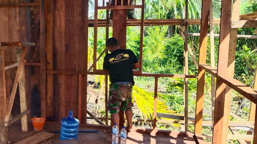 Satgas TMMD Kodim 1710/Mimika Lanjutkan Pemasangan Dinding Rumah Warga di Kampung Pigapu