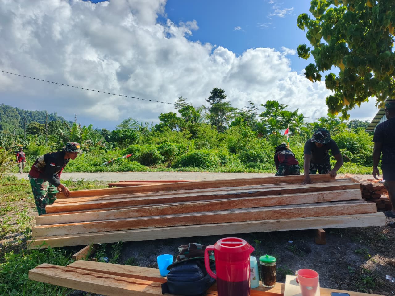 Kayu-kayu tersebut dipilih secara selektif dan diproses sesuai kebutuhan konstruksi rumah agar menghasilkan bangunan yang kokoh dan tahan lama. Proses ini melibatkan personel TNI bersama masyarakat setempat yang bahu-membahu dalam kegiatan tersebut.