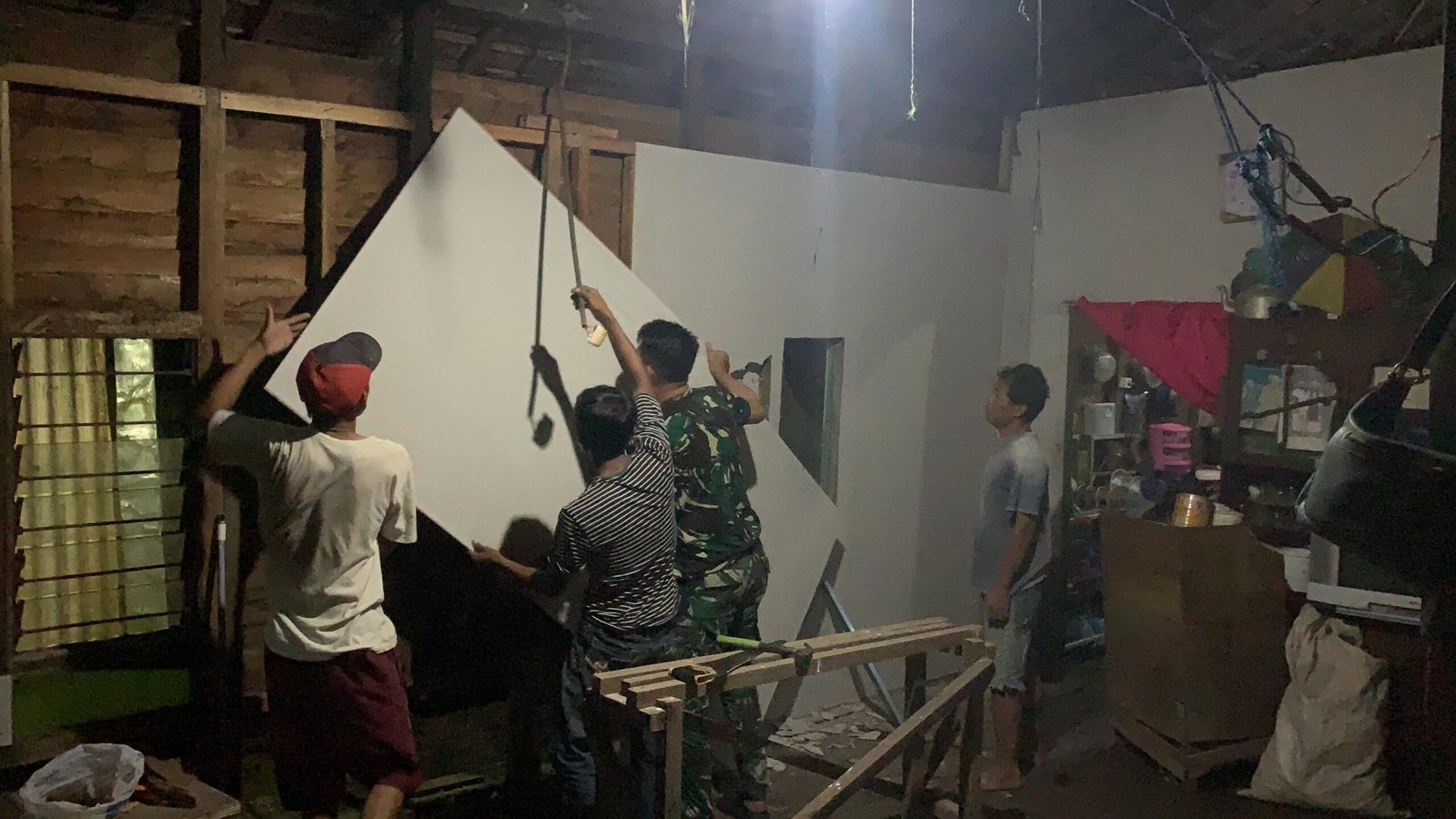 Meski cuaca mulai gelap, semangat gotong royong tak surut. Prajurit dan masyarakat bergotong royong menyelesaikan pekerjaan seperti pengecatan, pemasangan dinding, dan perbaikan atap agar hunian warga segera layak huni dan nyaman.
