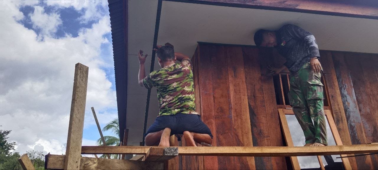 Satuan Tugas TNI Manunggal Membangun Desa (TMMD) mulai melaksanakan pemasangan plafon di salah satu sasaran fisik program TMMD ke-124 Kodim 1710/Mimika di Kampung Pigapu, Distrik Iwaka, Kab. Mimika. Rabu (21/5/2025)