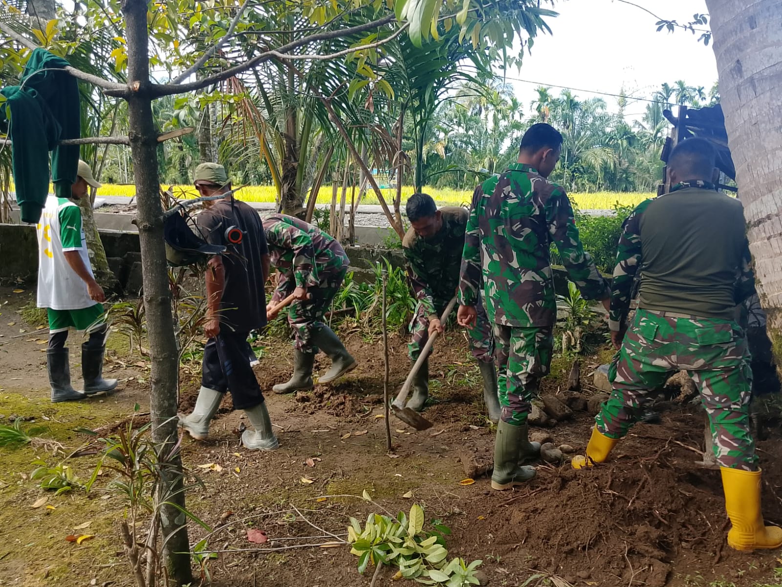Di lokasi kegiatan, anggota Satgas TMMD bersama warga setempat melaksanakan pembersihan area pembangunan, penggalian lubang septic tank, serta penggalian pondasi WC, Jumat (13/2).