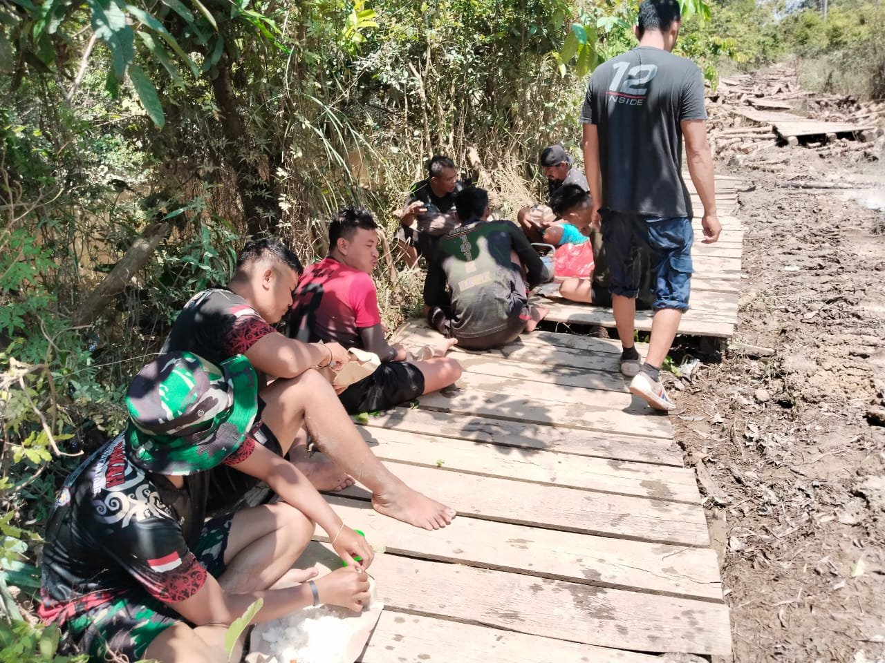 Barito Selatan – Suasana akrab tampak saat anggota Satgas TMMD Reguler Ke-124 Kodim 1012/Buntok melaksanakan makan siang bersama di sela-sela waktu istirahat, di Jalan Desa Talio, Kecamatan Karau Kuala, Kabupaten Barito Selatan, Minggu (18/05/2025).