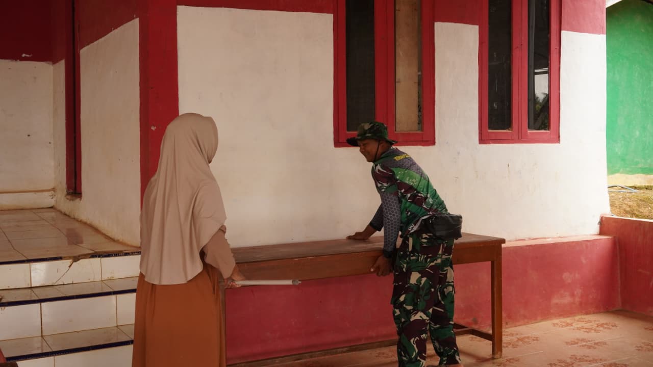 Kotawaringin Timur – Anggota Satgas TNI Manunggal Membangun Desa (TMMD) Reguler ke-127 dari Kodim 1015/Sampit sedang mempersiapkan lokasi untuk kegiatan sunat massal dengan membersihkan Aula Kantor Desa Tribuana, Kecamatan Antang Kalang, Kabupaten Kotawaringin Timur pada Kamis (12/02/2026).