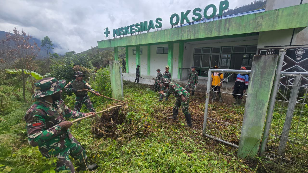 Satgas Yonif 751/VJS Laksanakan Karya Bakti Pembersihan Puskesmas di Oksop