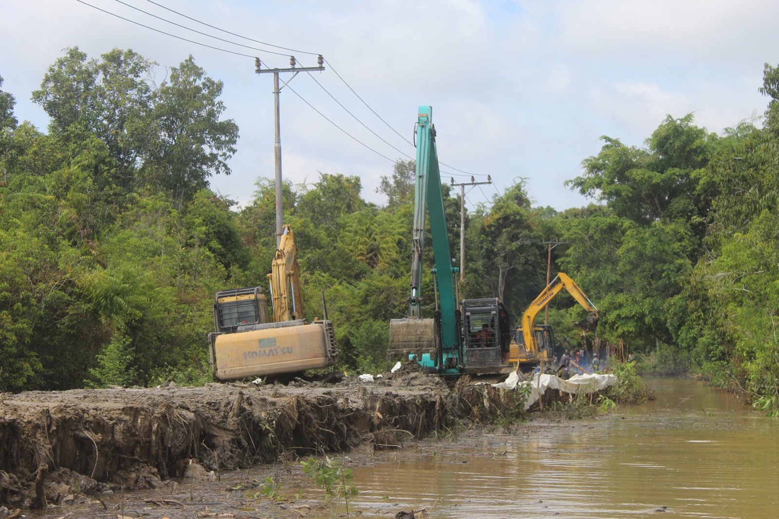 Personel Satgas dan operator alat berat bergotong royong di lapangan, memaksimalkan waktu kerja sejak pagi hingga sore hari. Penggunaan seluruh alat berat ini sangat membantu mengatasi medan yang sulit dan mempercepat proses konstruksi.