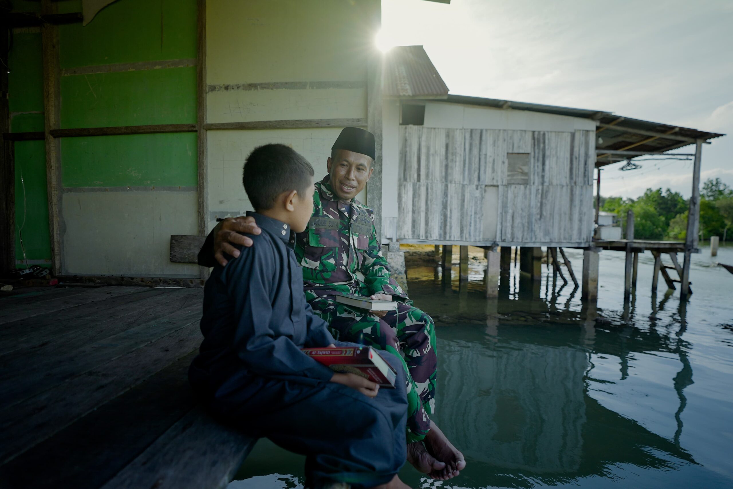 Di sebuah rumah panggung sederhana yang terletak di tepian air, Sertu La Ode Suka dengan penuh kesabaran membimbing anak-anak dalam melafalkan ayat-ayat suci Al-Qur’an. Kegiatan ini berlangsung dalam suasana yang hangat dan akrab, menciptakan nuansa kekeluargaan yang kental.