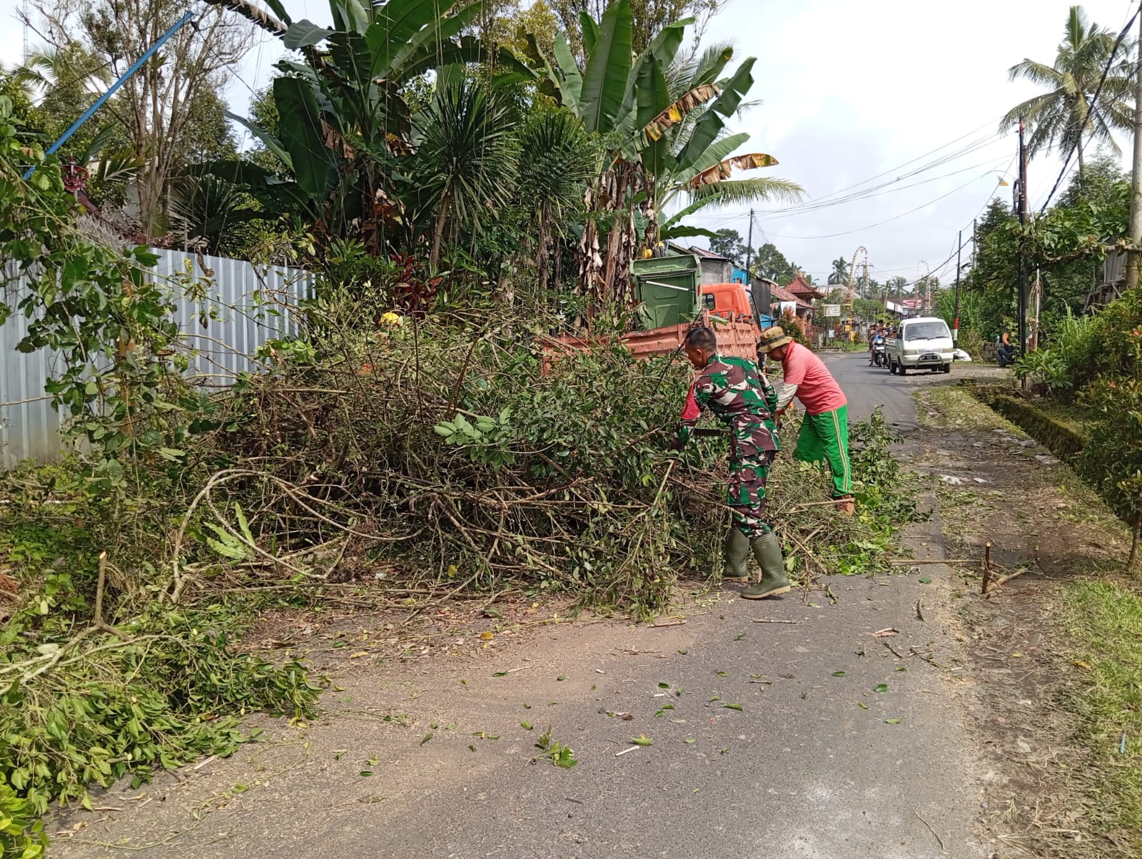 Bangli – Dalam upaya menjaga keselamatan pengguna jalan, Babinsa Desa Yangapi berkolaborasi dengan Dinas Lingkungan Hidup (DLH) Kabupaten Bangli untuk membersihkan ranting pohon beringin yang patah. Kegiatan ini berlangsung di Dusun Metra Kaja, Desa Yangapi, Kecamatan Tembuku pada Sabtu, 13 Desember 2025. Ranting-ranting tersebut, yang patah akibat cuaca ekstrem, menghalangi sebagian jalan dan menimbulkan potensi bahaya bagi pengendara.