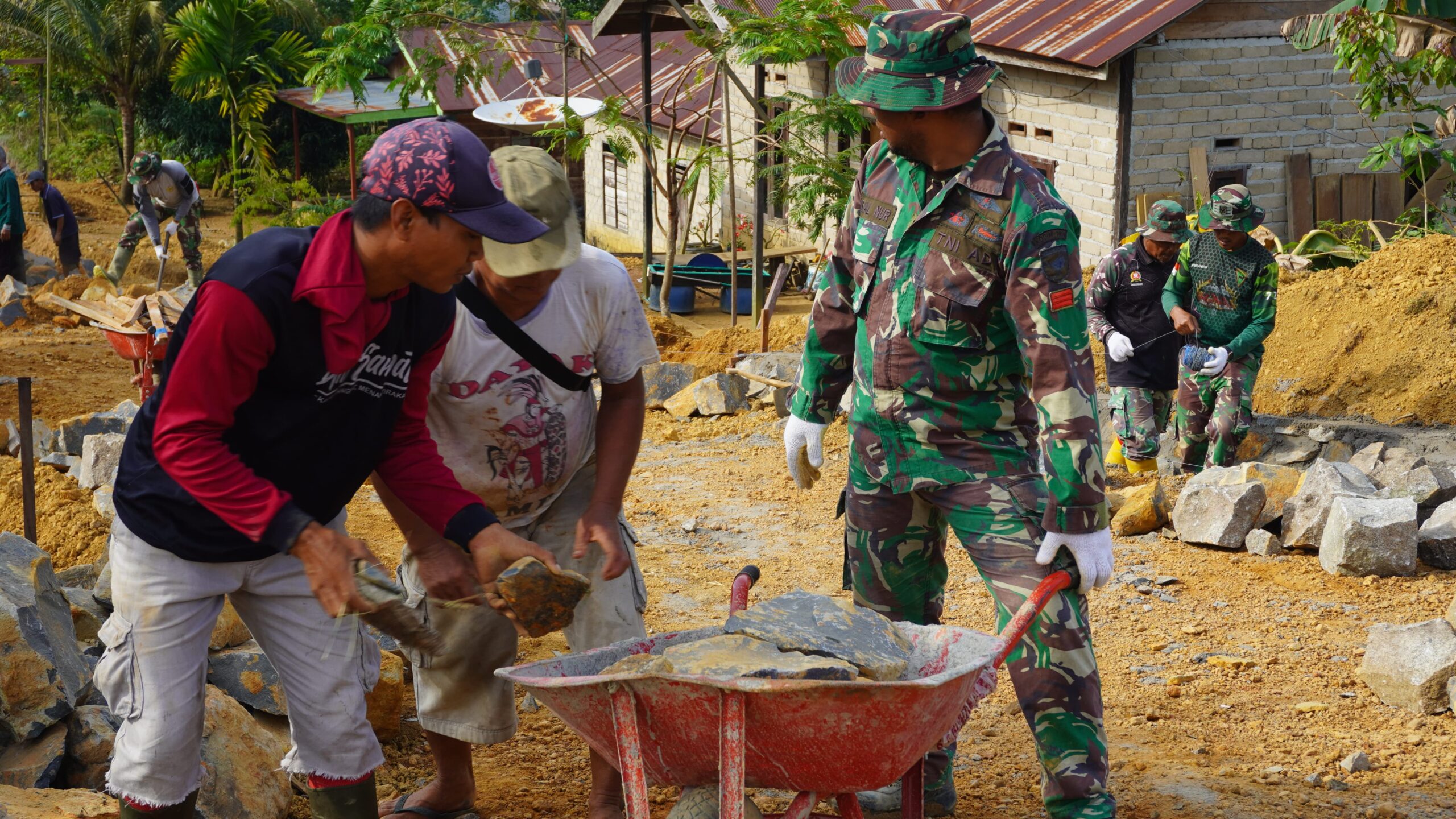Dengan semangat gotong royong, anggota Satgas TMMD dan masyarakat saling mendukung dalam proses pengerjaan, mulai dari penyediaan material hingga pemasangan konstruksi siring jalan sesuai dengan rancangan yang telah ditentukan.