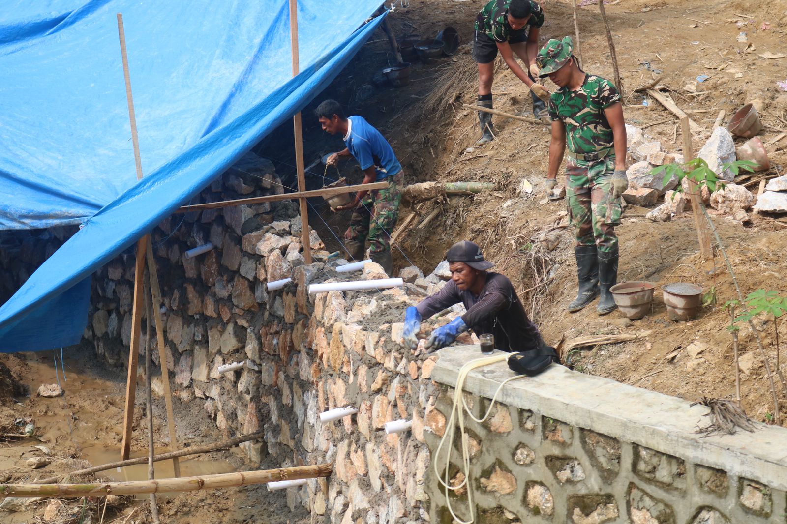 Kendari – Kerja sama antara Satgas TMMD ke-127 dan masyarakat setempat kembali terlihat dalam pembangunan talud di Kota Kendari pada Kamis (26/2). Anggota Satgas dan warga saling membantu dengan mengangkat batu, mencampur semen, serta menyusun material dengan rapi sehingga talud yang dibangun memiliki daya tahan yang baik dalam jangka panjang.