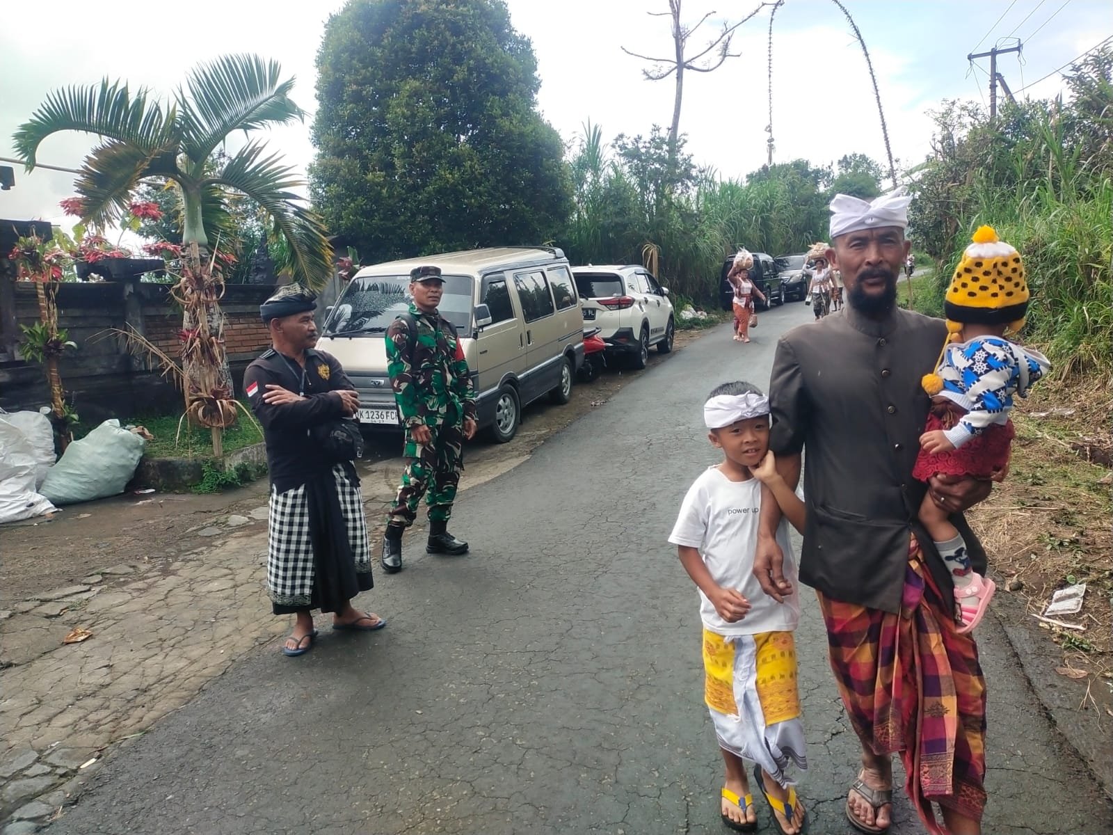 Bangli – Sebagai bentuk kebersamaan dan kepedulian terhadap warga binaan, Babinsa Koramil 04/Kintamani Kodim 1626/Bangli Serka Wayan Suastika bersinergi dengan pecalang melaksanakan kegiatan pemantauan sekaligus pengamanan kegiatan upacara Dewa Yadnya (Nyineb Sesuhunan Pure Puseh Blibu) di Banjar Wanasari, Desa Kintamani, Piodalan itu dihadiri warga binaan yang bertempat di Pure Puseh Blibu, Banjar Wanasari Desa Kintamani, Kecamatan Kintamani, Kabupaten Bangli, Kamis (15/05/25).