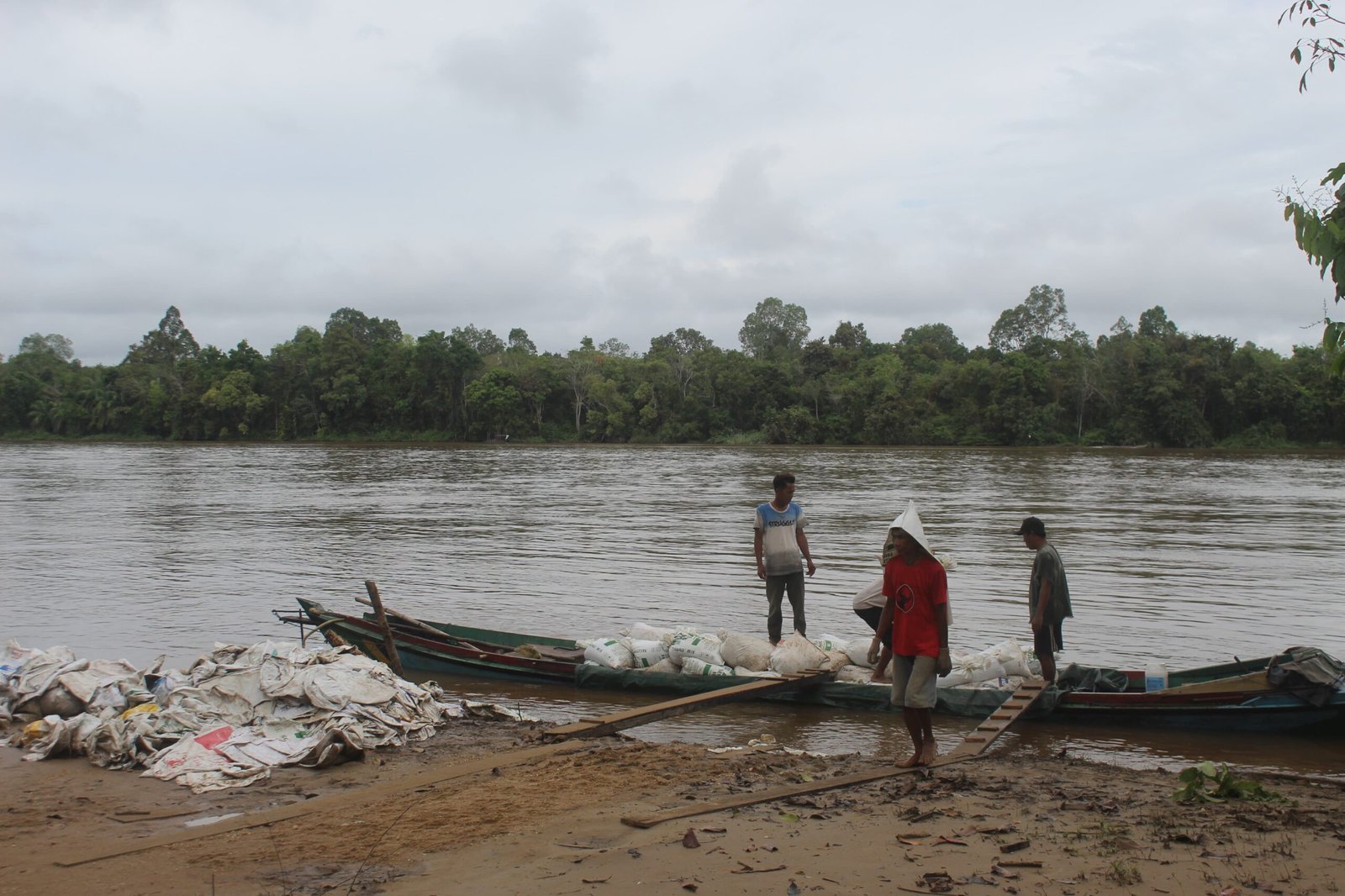 Setiap hari, perahu-perahu kecil tampak hilir mudik membawa material. Di atas perahu, warga menjaga stabilitas muatan sambil terus berkoordinasi dengan Satgas yang menunggu di lokasi pembangunan. Proses distribusi ini membutuhkan ketelitian dan kerja sama yang erat.