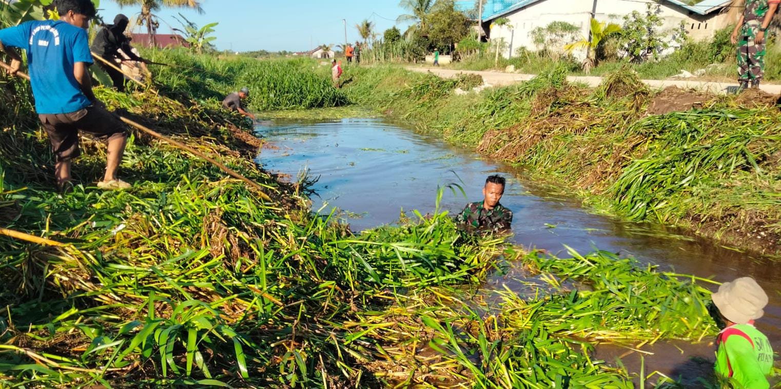Mempawah – Guyuran matahari tak menyurutkan semangat anggota Satgas TMMD ke-124 untuk turun langsung ke dalam sungai Desa Sungai Purun Kecil. Mereka menyingsingkan lengan, menanggalkan sepatu, dan nyemplung ke aliran sungai demi mencabut gulma yang tumbuh liar dan menghambat aliran air.