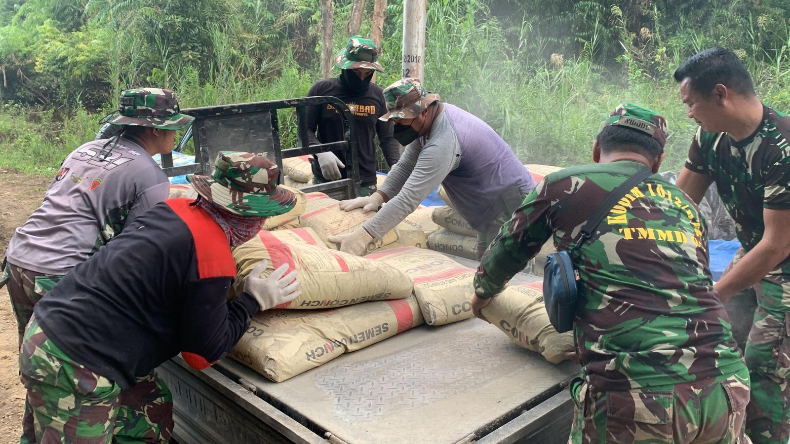 Tentara dan warga menggunakan berbagai alat bantu, mulai dari gerobak hingga kendaraan kecil, untuk memastikan material sampai dengan aman dan tepat waktu. Kegiatan ini berlangsung dengan semangat tinggi meskipun cuaca cukup terik.