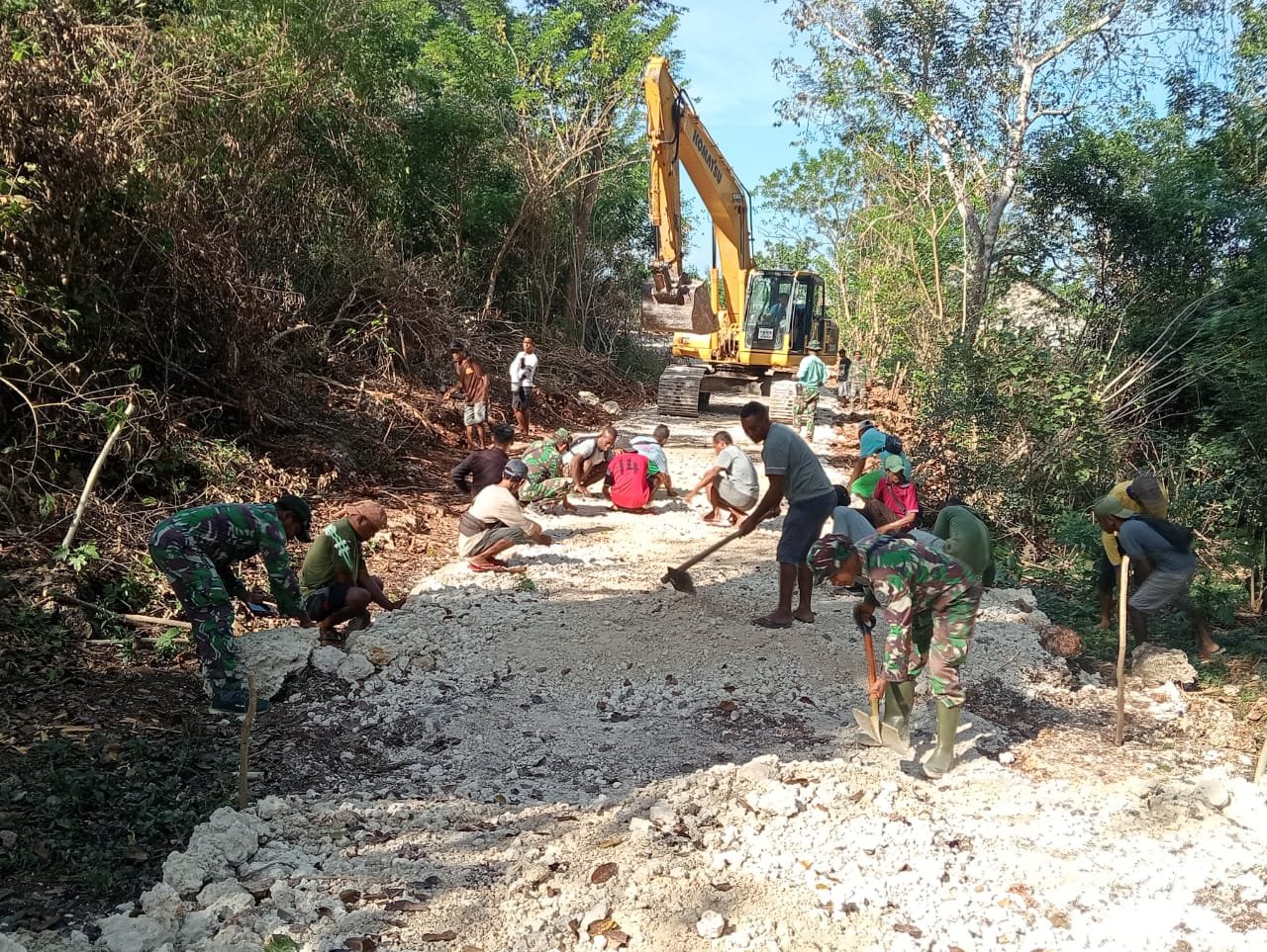 Tampak prajurit Satgas TMMD Kodim 1604/Kupang seakan tak pernah kenal lelah bersama-sama dengan warga masyarakat pulau Matahari terbenam gotong royong mengerjakan jalan baru program TMMD di Desa Huilellot, Kecamatan Semau, Kabupaten Kupang, Jumat (16/5/2025).