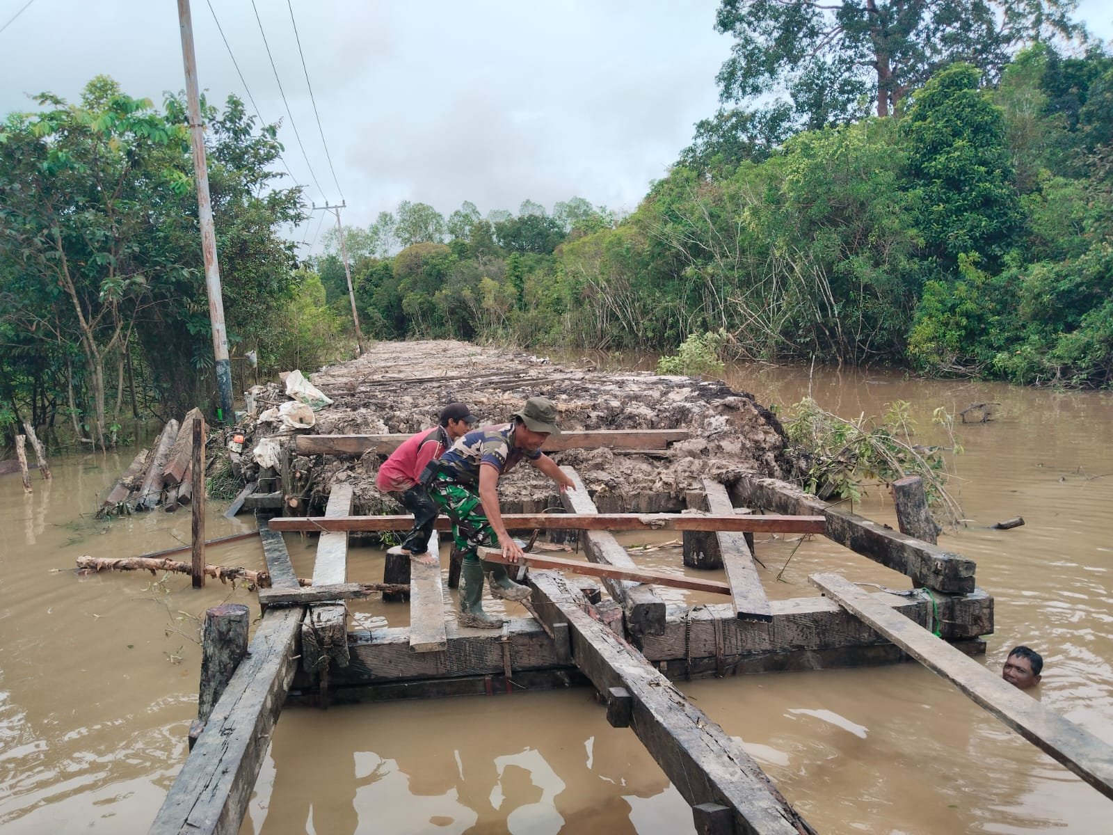 Tampak terlihat semangat dan kekompakan personel Satgas TMMD Kodim 1012/Buntok pembuatan pondasi jembatan