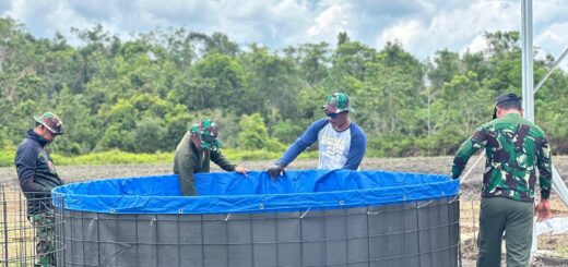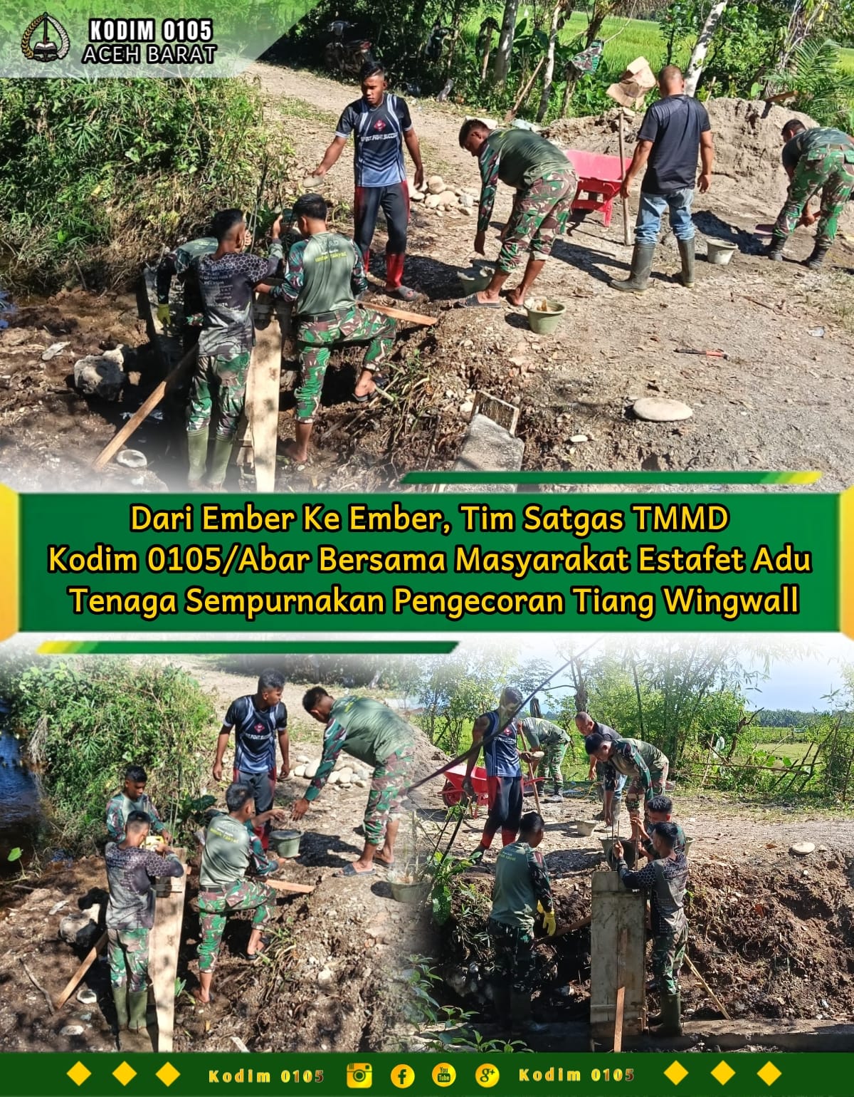 ACEH BARAT – Pembangunan tiang wingwall dalam program TMMD Reguler ke-127 Kodim 0105/Abar berlangsung penuh semangat kebersamaan di Desa Pasi Aceh, Senin (23/2/2026).
