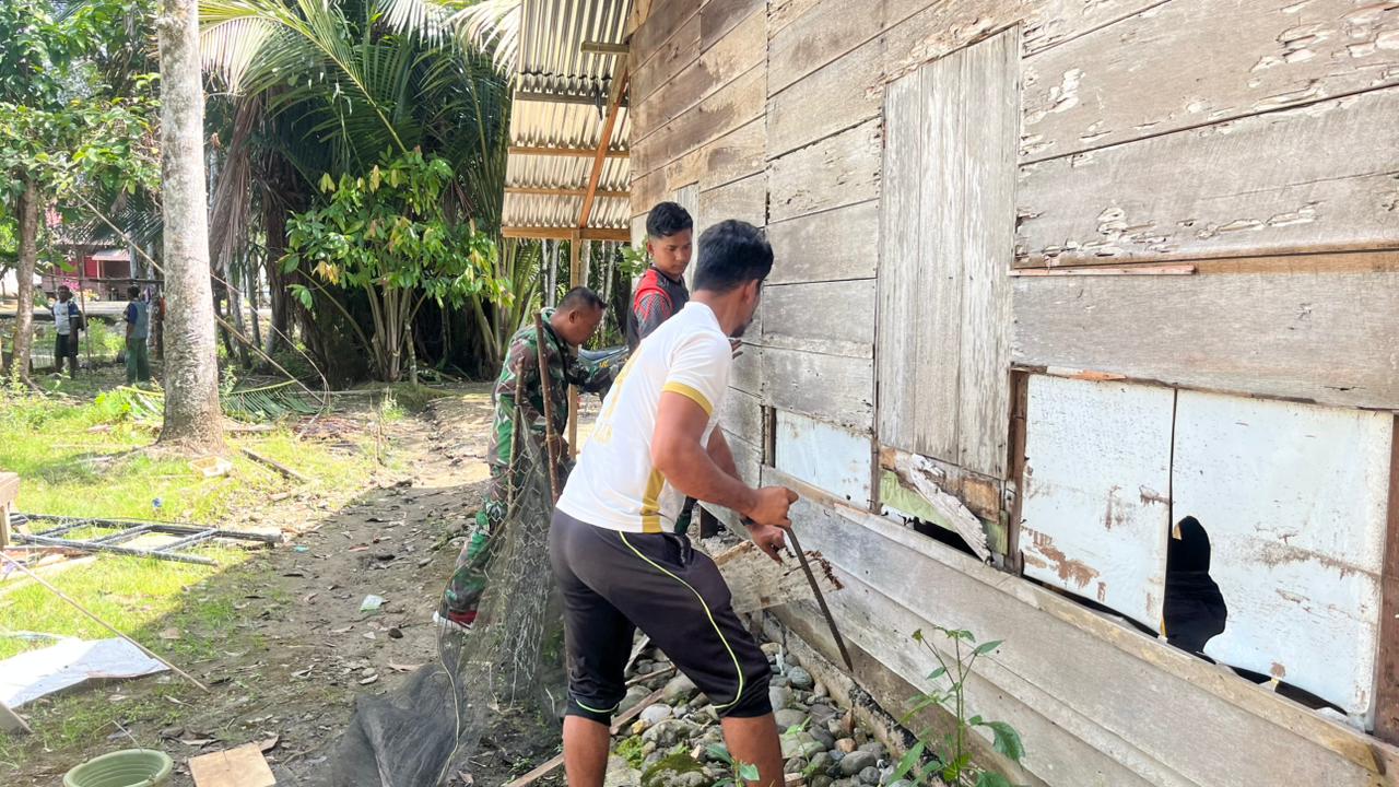 Sejak pengerjaan dimulai, prajurit Satgas TMMD bekerja tanpa mengenal lelah. Mereka membongkar bagian rumah yang tak lagi kuat, lalu menggantinya dengan material baru. Suara palu beradu menjadi irama perubahan yang perlahan menghidupkan kembali bangunan tersebut.