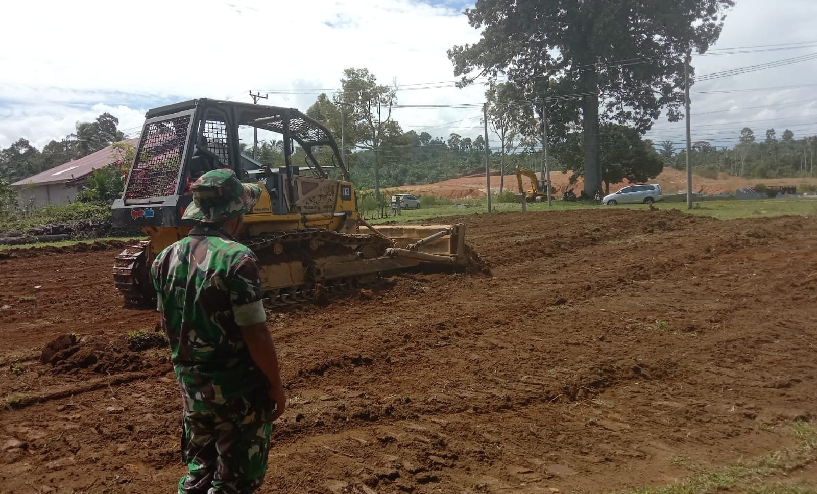 Kaur- Satgas TMMD Ke-124 Kodim 0408/BS garap lahan pembuatan lapangan voly di Desa Bandu Agung Kecamatan Kaur Utara Kabupaten Kaur,Senin (19/5/25).