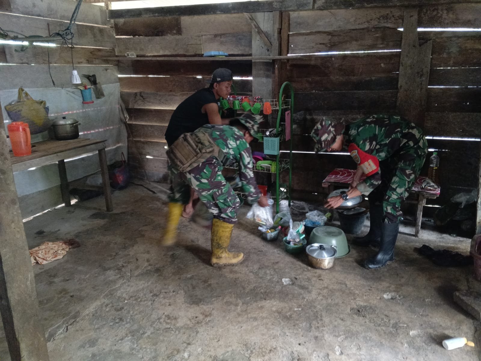 Proses pengosongan dilakukan secara bergotong royong antara anggota Satgas TMMD dan masyarakat setempat. Barang-barang rumah tangga milik Pak Sobriyanto dipindahkan ke tempat yang aman agar pekerjaan renovasi segera bisa dimulai.