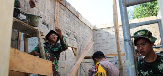 Pekerjaan pemasangan granit dilakukan secara gotong royong oleh personel Satgas TMMD bersama warga jemaat, sebagai bentuk partisipasi aktif dan rasa memiliki terhadap hasil pembangunan yang sedang berlangsung.