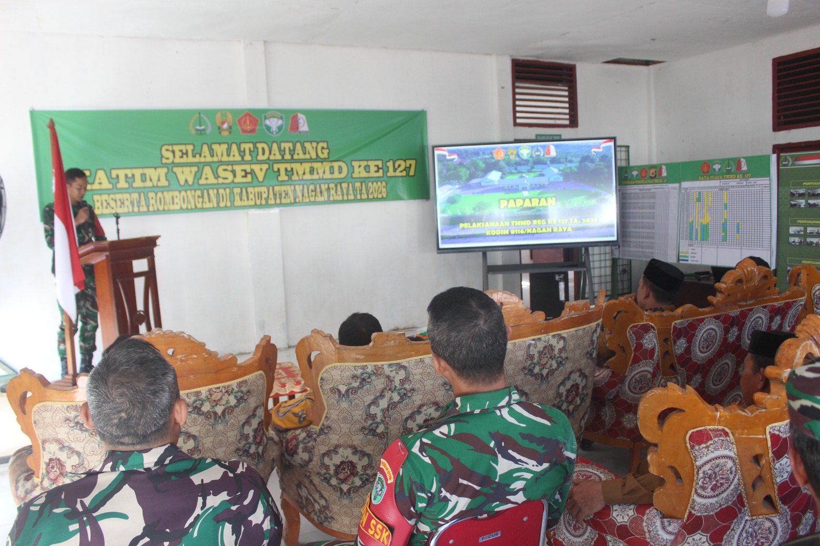 Kegiatan diawali dengan pemaparan mengenai perkembangan pelaksanaan program TMMD di wilayah Kabupaten Nagan Raya. Dalam pemaparan tersebut dijelaskan berbagai sasaran fisik maupun nonfisik yang tengah dikerjakan oleh Satgas TMMD bersama masyarakat.