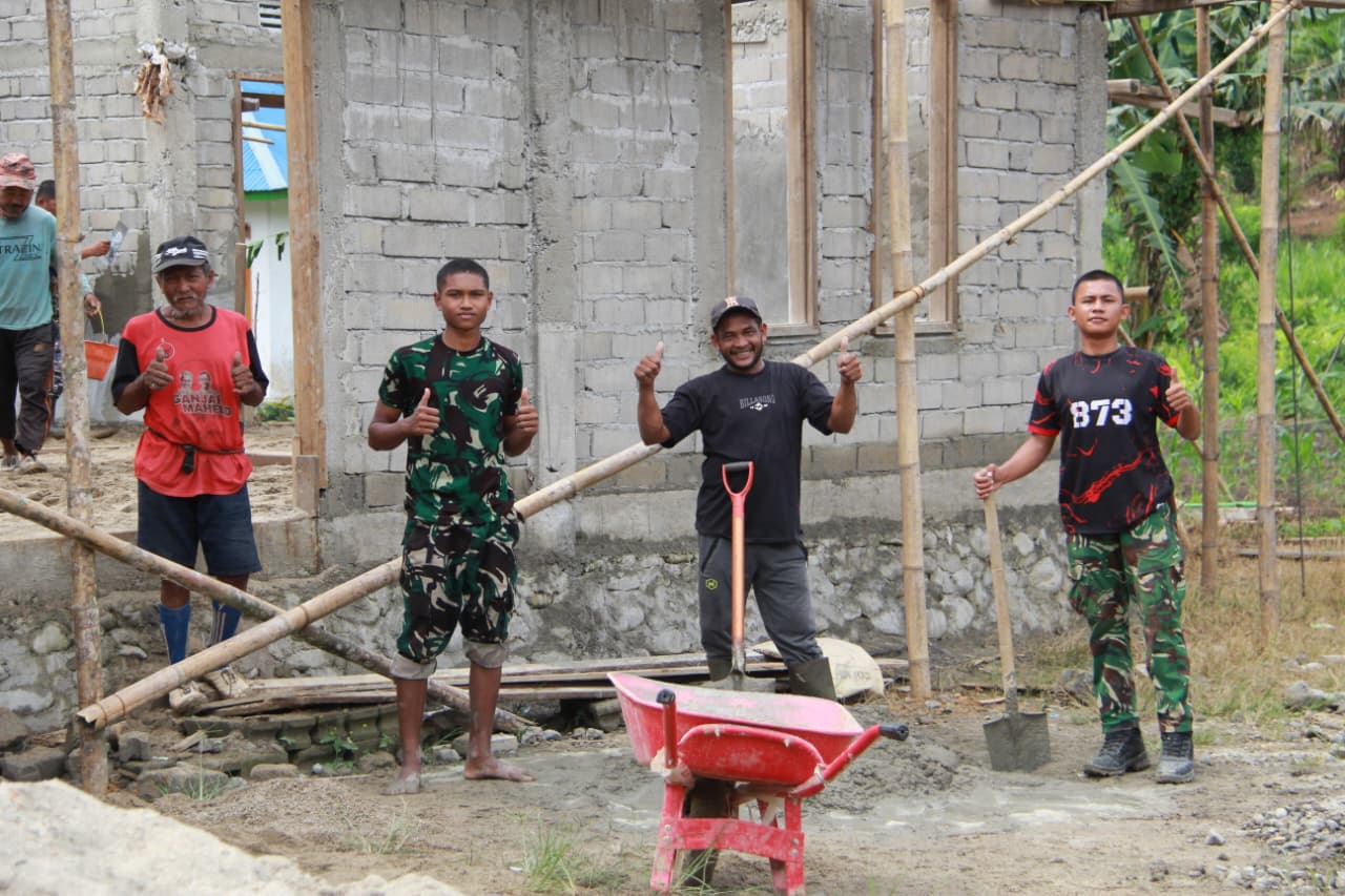 Dalam proses pembangunan, personel Satgas TMMD bersama masyarakat terlihat aktif bergotong-royong, mulai dari persiapan material hingga pelaksanaan konstruksi, yang menandakan kuatnya sinergi antara TNI dan rakyat.